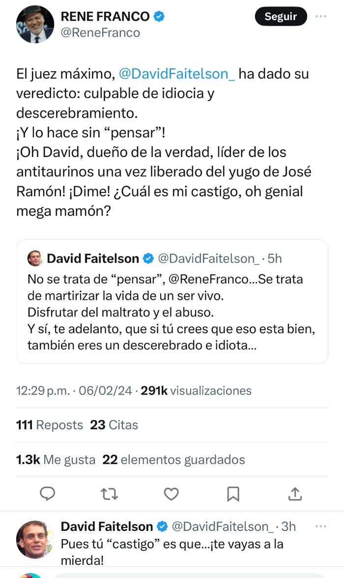 Las corridas de toros han adquirido bastante relevancia en las redes sociales luego de que un tribunal colegiado revocó la suspensión de estos eventos que previamente había otorgado un juez, así como los festejos llevados a cabo por el 78 aniversario de la Monumental Plaza México.En medio de esta polémica apareció el periodista René Franco, quien protagonizó una discusión en X (antes Twitter) con el comentarista David Faitelson, hasta el punto de llegar a los insultos.El enfrentamiento entre estos dos personajes comenzó cuando Franco citó un mensaje en X en donde comentaristas de TUDN califican de “idiotas, descerebrados, cobarde y ´sádicos” a los asistentes a las corridas de toros celebradas en los últimos días en la Plaza de Toros México: “Aquí, un señor que dice que sabe más que ellos, le llama ‘descerebradas’ e ‘idiotas’ a las personas que no piensan como él”, escribió el locutor del extinto programa “La Taquilla”.Tras esto, Faitelson respondió a este mensaje aclarando que para él no se trata de “pensar”, sino de “martirizar la vida de un ser vivo”, y concluyó diciendo: “si tú crees que eso esta bien, también eres un descerebrado e idiota”. La discusión continuó entre Franco y Faitelson, generando reacciones entre los cibernautas con personas que se pronunciaron a favor de las corridas y otros que condenaron el maltrato animal.SV