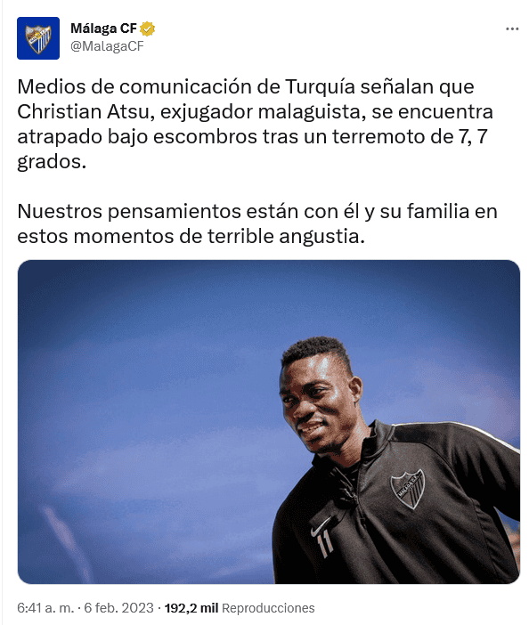 En las últimas horas, el mundo ha mandado sus oraciones y algunos apoyos a Turquía, país que ha sufrido las consecuencias de un terremoto de magnitud 7.8. Como desgraciadamente suele pasar con estos eventos, entre los escombros quedan atrapadas las personas y entre ellas está el futbolista Christian Atsu, quien hace algunos años fue compañero de Memo Ochoa en el Málaga de España.Atsu, ghanés de 31 años de edad, actualmente milita en el Hatayspor de la Superliga de Turquía y ahora es buscado por los rescatistas. La información fue compartida por el propio Málaga en sus redes sociales:"Medios de comunicación de Turquía señalan que Christian Atsu, exjugador malaguista, se encuentra atrapado bajo escombros tras un terremoto de 7, 7 grados. Nuestros pensamientos están con él y su familia en estos momentos de terrible angustia".El portero mexicano Guillermo Ochoa reaccionó a la publicación del Málaga en la que se dio a conocer la desaparición entre los escombros del centrocampista Christian Atsu. El ahora arquero de la Salernitana de la Serie A en Italia respondió al mensaje compartido por su antiguo equipo con un par de emojis de manos en oración.OF