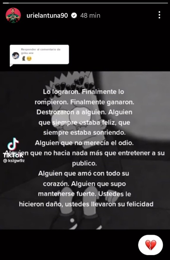 Parecía que Uriel Antuna saldría en los próximos días de Cruz Azul para ir al futbol de Grecia con el Panathinaikos, pero un enigmático mensaje publicado en su cuenta de Instagram hace pensar todo lo contrario.Este lunes, el futbolista de La Máquina y la Selección Mexicana compartió una extraña historia que dice lo siguiente: "Lo lograron. Finalmente lo rompieron. Finalmente ganaron"."Destrozaron a alguien. Alguien que siempre estaba feliz, que siempre estaba sonriendo", continúa el atacante."Alguien que no merecía el odio. Alguien que no hacía nada más que entretener a su público. Alguien que -ilegible- con todo su corazón. Alguien que supo mantenerse -ilegible-. Ustedes le hicieron daño, ustedes se llevaron su felicidad".Además, Antuna añadió un corazón roto a la historia en su cuenta.OF