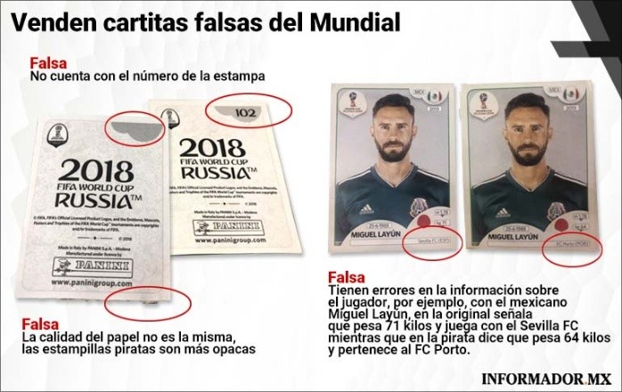 "Nosotros tenemos los jugadores más difíciles, desde los rusos, los mexicanos y las de Coca", le dijo un vendedor de cartitas Panini a un joven de 15 años. El comerciante le vendió cinco estampas en 20 pesos y se las entregó en una bolsa chica de plástico. Cuando él llegó a su casa se dio cuenta que eran piratas.Los amantes de la piratería no perdonaron a Panini y en Guadalajara se pueden encontrar las tarjetas de cualquier jugador, y es que falta menos de un mes para que inicie la Copa del Mundo Rusia 2018 y los aficionados quieren completar su álbum y tener cualquier recuerdo de la gran fiesta del futbol internacional.Desde que salió a la venta el álbum Panini, en marzo de este año, hubo muchas quejas respecto al precio de cada sobre, pues cuestan el doble que el Mundial pasado. Aun así ha sido un éxito y los fanáticos han organizado desde intercambios masivos hasta la compra- venta de forma individual para llenar el libro coleccionable.A simple vista, las cartas piratas no son muy distintas a las originales, sin embargo te puedes dar cuenta de la falsedad si en el reverso no cuentan con el número de posición que tiene la estampa en el álbum. Esto se debe a que los vendedores imprimen grandes cantidades de hojas con el mismo diseño para ahorrarse tiempo y dinero.Aparte de la calidad del papel, las estampillas piratas son más opacas y además tienen errores en la información sobre el jugador, por ejemplo, con el mexicano Miguel Layún, en la original señala que pesa 71 kilos y juega con el Sevilla FC mientras que en la pirata dice que pesa 64 kilos y pertenece al FC Porto.El Artículo 424 del Código Penal Federal establece penas de tres a 10 años de prisión y multas de dos a 20 mil días de salario mínimo a quien produzca, reproduzca, introduzca al país, almacene, transporte, distribuya, venda o arriende copias de obras, fonogramas, videogramas o libros protegidos por la Ley Federal del Derecho de Autor sin autorización.JB
