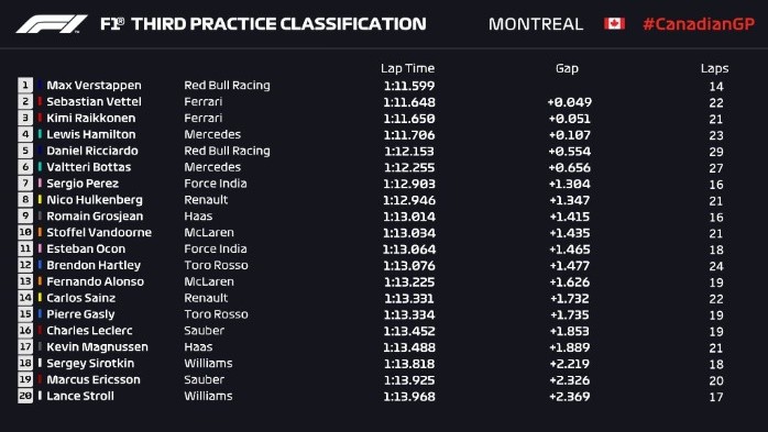 El holandés Max Verstappen (Red Bull), que el viernes había marcado el mejor tiempo en la primera jornada de entrenamientos libres para el Gran Premio de Canadá, que se disputa en el circuito Gilles Villeneuve de Montreal, fue el más rápido también este sábado en el tercer y último ensayo para la séptima prueba del Mundial de Fórmula Uno.Verstappen cubrió, en la mejor de sus 14 vueltas, los 4.361 metros de la pista canadiense en un minuto, once segundos y 599 milésimas, 49 menos que el cuádruple campeón mundial de F1 alemán Sebastian Vettel (Ferrari), que marcó el segundo tiempo, con dos milésimas de ventaja sobre su compañero finlandés Kimi Raikkonen.El inglés Lewis Hamilton (Mercedes), líder del campeonato, con 110 puntos (14 más que Vettel), marcó el cuarto tiempo, de un minuto, once segundos y 706 milésimas, 107 más que el crono de Verstappen.El mexicano Sergio Pérez (Force India) acabó séptimo el último ensayo libre previo a la calificación. "Checo" dio 16 vueltas y paró el crono en 1:12.903, a un segundo y tres décimas de Verstappen.Los españoles Fernando Alonso (McLaren-Renault) y Carlos Sainz (Renault) se inscribieron decimotercero y decimocuarto, respectivamente, en la tabla de tiempos, a más de segundo y medio del joven holandés. RR