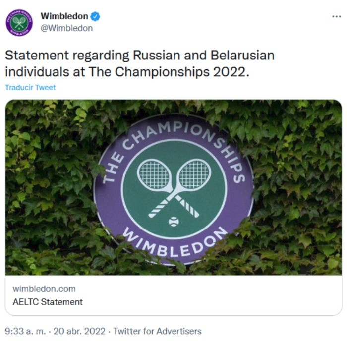 ¡Última hora! Los tenistas rusos y bielorrusos no podrán jugar el torneo de Wimbledon 2022 debido a la guerra en Ucrania, anunció el All England Club este miércoles 20 de abril.Entre los jugadores afectados por el veto se destacan el campeón del último US Open, Daniil Medvedev, número dos del ranking de la ATP; Andrey Rublev, octavo; Aryna Sabalenka, semifinalista en Wimbledon en 2021 y cuarta en el ranking de la WTA; Victoria Azarenka, ex número uno del mundo y dos veces campeona del Abierto de Australia; y Anastasia Pavlyuchenkova, finalista del Roland Garros el año pasado.El torneo de Wimbledon 2022 comienza el próximo 27 de junio.Muchas competencias internacionales han excluido a los deportistas rusos desde que su país invadió Ucrania. Bielorrusia ha ayudado a la invasión.OF