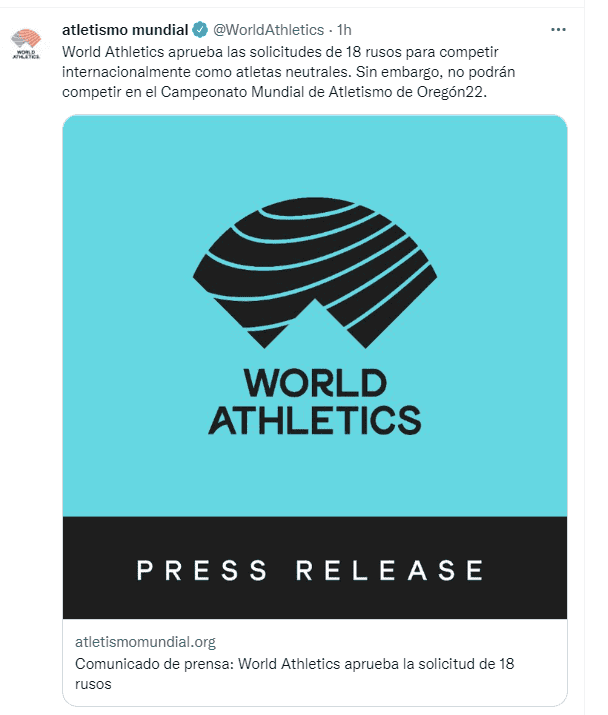 La Federación Internacional de Atletismo, World Athletics, aprobó este viernes el estatus neutral para 18 atletas rusos, aunque descartó que participen en los Mundiales de 2022."La Junta de Revisión de Dopaje de World Athletics (DRB) acordó que las solicitudes de 18 atletas rusos cumplieron con los criterios de elegibilidad excepcionales para participar en competencias internacionales como atletas neutrales", anunció la federación en un comunicado.Sin embargo, mantuvo la suspensión de la Federación Rusa, vigente desde 2015.Además, señaló que en concordancia con la decisión de excluir a todos los atletas rusos de los Mundiales de 2022 por la campaña militar rusa en Ucrania, los deportistas rusos no podrán competir en este evento pese a su estatus neutral.Según World Athletics, los deportistas rusos con estatus neutral podrán participar en otras competencias internacionales en la medida en que estas estén abiertas a los atletas de Rusia.Con esta decisión, el número de atletas rusos con estatus neutral ascendió a 73.PC