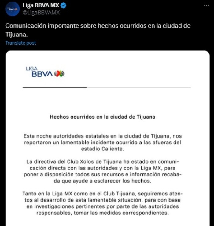 Después de que una pelea entre aficionados del Tijuana y el Guadalajara terminara con una persona herida por un disparo de arma de fuego en la cabeza, el club Xolos se pronunció asegurando que pondrá a disposición de las autoridades todos sus recursos e información en su poder para esclarecer los hechos."La directiva del Club Xolos de Tijuana ha estado en comunicación directa con las autoridades y con la Liga MX, para poner a disposición todos sus recursos e información recabada que ayude a esclarecer los hechos. Tanto en la Liga MX como en el Club Tijuana, seguiremos atentos al desarrollo de esta lamentable situación, para con base en investigaciones pertinentes por parte de las autoridades responsables, tomar las medidas correspondientes", se lee en el comunicado.La Liga MX, por su parte, secundó la postura del club fronterizo. La agresión ocurrida en el estacionamiento del estadio Caliente fue contra un hombre de entre 40 y 45 años identificado extraoficialmente como Alfredo Cárdenas, el cual participó en la pelea en las gradas.En videos publicados en redes sociales se observa a una decena de hombres intercambiando golpes, y después a uno de ellos, con camiseta de Xolos y pantalón blanco, tirado en el piso, asistido por una mujer que lamenta lo sucedido. En ninguno aparecen elementos de seguridad.Desde el año 2022, a partir de la colosal bronca entre aficionados de Atlas y Gallos en Querétaro, la liga tomó medidas para reducir las posibilidades de este tipo de incidentes, como el Fan ID y el protocolo Estadio Seguro. Según mencionó Mikel Arriola, presidente de la Liga MX, el pasado mes de marzo en la "Reunión Futbol Seguro", con estas acciones se lograron reducir los incidentes violentos en un 25 %. Esta noche puede haber ocurrido otra tragedia.