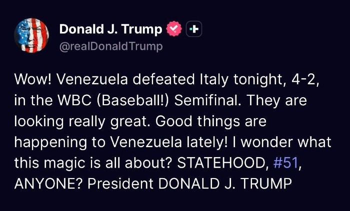 “¡Vaya! Venezuela derrotó esta noche a Italia por 4-2 en la semifinal del WBC (¡beisbol!). Están luciendo realmente genial. Últimamente le están pasando cosas buenas a Venezuela. Me pregunto a qué se debe toda esta magia… ¿Estado número 51?, ¿alguien se anima?”, escribió en un mensaje en Truth Social.