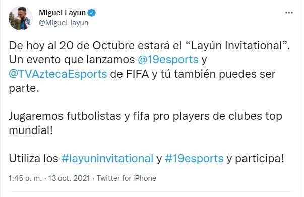 Miguel Layún, único futbolista mexicano en jugar en las tres principales Ligas europeas (Italia, Inglaterra y España), anunció este miércoles que organizará la segunda edición del 'Layún Invitational,' ahora con un torneo de FIFA 21."Va a ser calidad 'top'. Vamos a jugar 19esports contra clubes 'top' a nivel mundial, uno de ellos será el Wolverhampton inglés", dijo el lateral del América mexicano en una transmisión en su cuenta de Twitter.El zaguero, que disputó con México los Mundiales de Brasil 2014 y Rusia 2018, no reveló la fecha del torneo ni a los demás participantes, pero sí adelantó que los 'gamers' mexicanos que quieran jugarlo tendrán que superar una eliminatoria el 22 y 23 de octubre a la cual ya se pueden inscribir."El ganador va a tener acceso a jugar la final con nosotros o contra nosotros", señaló el antiguo jugador del Sevilla español y del Watford inglés.Además de la eliminatoria, los videojugadores podrán ganarse un lugar en el 'Layún Invitational' si generan conversación en Twitter con la etiqueta del evento."La segunda forma de participar es enviando tuits con las etiquetas #layuninvitational y #19esports, en los que tendrán que comentar del evento, decir que quieren participar. Mientras más tuits manden más posibilidades tendrán de ganar. Los ganadores serán nueve, uno se llevará un jersey de 19esports y ocho jugarán un clubes pro conmigo y los dos 'gamers' de FIFA del equipo", dijo.El defensa de las Águilas prometió que entre los participantes habrá futbolistas profesionales, como en la primera edición del torneo en la que Javier 'Chicharito' Hernández, entre otros, jugaron PUBG Mobile.El deportista de 33 años reveló que los narradores de las partidas serán los comentaristas de la televisión mexicana Christian Martinoli y Luis García."Creemos que la escena de eSports no solo tiene que ser entretenimiento, sino que convivan con nosotros, se conozcan entre la comunidad 'gamer'. Es el primer evento que lanzamos y les pedimos su apoyo", expresó Layún.El pasado julio, Layún cumplió un año con 19esports, su equipo de deportes electrónicos en el que cuenta con conjuntos en los videojuegos Valorant, FIFA y PUBG Mobile, con presencia en México y Europa. JL
