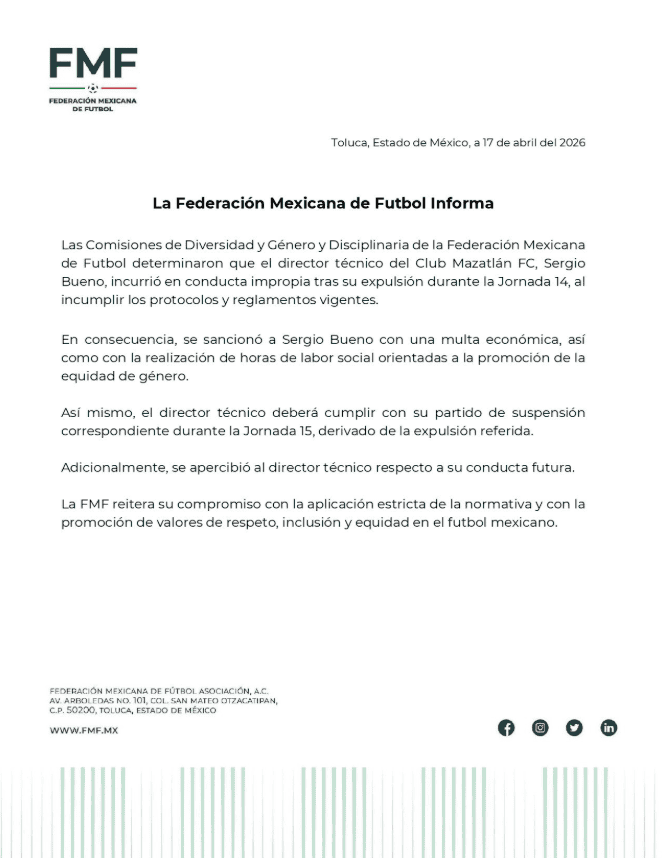 La Federación Mexicana de Futbol (FMF) dio a conocer la sanción impuesta a Sergio Bueno, entrenador de Mazatlán FC, luego de los insultos misóginos dirigidos a la árbitra Katia Itzel García tras su expulsión en la jornada anterior frente a Pumas de la UNAM en Ciudad Universitaria.De acuerdo con lo informado, el estratega mexicano recibió una multa económica y deberá cumplir con horas de labor social enfocadas en la promoción de la equidad de género. Además, fue apercibido sobre su conducta futura, en un intento por evitar que se repitan este tipo de situaciones dentro del futbol profesional."Las Comisiones de Diversidad y Género y Disciplinaria de la Federación Mexicana de Futbol determinaron que el director técnico del Club Mazatlán FC, Sergio Bueno, incurrió en conducta impropia tras su expulsión durante la Jornada 14, al incumplir los protocolos y reglamentos vigentes", reveló la FMF mediante un comunicado.A la sanción se suma el partido de suspensión que deberá cumplir durante la Jornada 15, consecuencia directa de la expulsión ocurrida en Ciudad Universitaria. En lo deportivo, Mazatlán FC atraviesa un momento complicado en el torneo. Con apenas 11 puntos y prácticamente sin opciones de clasificar, los Cañoneros recibirán este viernes a Querétaro FC, mientras que Sergio Bueno podrá reaparecer en el banquillo el próximo martes, cuando enfrenten en casa a Deportivo Toluca FC.Con información del Universal MF