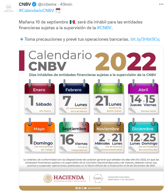 Los bancos en México operarán con normalidad este jueves 15 de septiembre, pero mañana viernes suspenderán labores.Debido a que es considerado día festivo o feriado, el 16 de septiembre las entidades financieras cerrarán sus puertas.Por ello, la Comisión Nacional Bancaria y de Valores (CNBV) sugirió a los usuarios tomar precauciones y prever sus operaciones.A través de Twitter recordó que el 16 de septiembre es día inhábil para las entidades financieras sujetas a la supervisión de la CNBV.Algunos bancos que operan dentro de plazas comerciales sí laboran, por lo que los usuarios que necesiten realizar alguna operación podrían acudir allí.El servicio de cajeros, banca móvil, banca electrónica y banca telefónica se mantendrán en funcionamiento de forma normal.En lo que resta del año, los bancos también suspenderán operaciones los días 2 y 21 de noviembre, así como 12 y 25 de diciembre, aunque este último es domingo.OA
