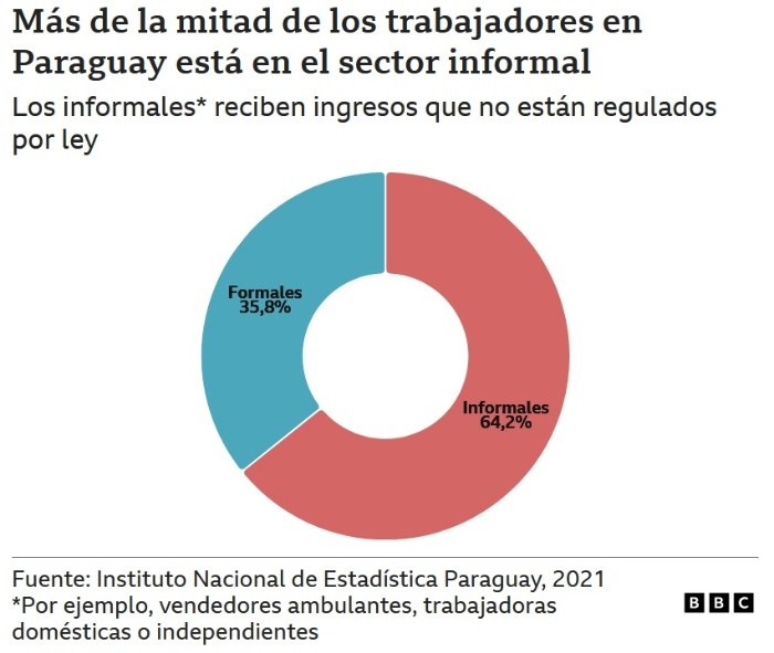 La economía de Paraguay ha sido elogiada en el pasado por los organismos internacionales por el crecimiento, la reducción de la pobreza y el orden en las finanzas fiscales.Sin embargo, presenta una serie de grietas que suponen un reto para un país que este domingo acude a las urnas para elegir al próximo presidente.El candidato oficialista del conservador Partido Colorado, Santiago Peña, se enfrenta al opositor Efraín Alegre para llevar las riendas de la nación sudamericana durante los próximos cinco años en unos comicios cuyos resultados se espera sean reñidos.El ganador tendrá que enfrentar varios desafíos económicos y sociales como la evasión de impuestos, la informalidad laboral, el duro impacto de la sequía y la pobreza que afecta especialmente a los campesinos e indígenas.En cuanto a las finanzas públicas, el nuevo presidente tendrá que hacerse cargo de un alto déficit fiscal para un país como Paraguay (de un 3% del Producto Interno Bruto, PIB) que merma las posibilidades de inversión pública en salud, educación, vivienda, y en el acceso a servicios tan básicos como el alcantarillado.Con la agricultura y la ganadería como base de su crecimiento económico, Paraguay es actualmente el tercer exportador mundial de soja y el octavo de carne de vacuno, dos sectores que, por años, han definido el rumbo económico de la nación.Siendo un país con una de las cargas tributarias más bajas de la región, las grandes empresas que producen y exportan estos productos suelen estar en el centro de acalorados debates sobre los beneficios económicos que le aportan a las arcas fiscales.Frente a los desafíos, Alegre, el candidato que lidera la alianza de centro-izquierda Concertación Nacional, ha dicho que favorecerá la austeridad fiscal para recortar el gasto del sector público en lugar de aumentar los impuestos a los agricultores del país.Peña, la principal carta del partido gobernante, se comprometió durante la campaña a terminar con la evasión de impuestos e impulsar políticas para que más personas trabajen en la economía formal. Tampoco tiene en sus planes una subida de impuestos.Con motivo de las elecciones, BBC Mundo muestra en gráficos algunas de las grietas que dejan al descubierto las precariedades del sistema económico y social paraguayo, así como a los avances que el país ha logrado en los últimos años.Los cimientos productivos del país sudamericano, que comparte frontera con Brasil, Argentina y Bolivia, están basados en la riqueza de la tierra, ya que apenas hay industria en el país.El problema es que los golpes que le han dado las fuertes inundaciones y las peores sequías de las últimas décadas a la producción agropecuaria, especialmente a la soja, hacen que el crecimiento económico suba y baje, de un año a otro, como si fuera una montaña rusa.La abrupta caída del PIB en 2012, 2019 o 2020, por ejemplo, estuvo influida por la falta de lluvias o la combinación de inundaciones y sequía.Así también ocurrió en 2021, cuando la cosecha de granos cayó 66%, solo que no se notó tanto en el PIB porque el país venía recuperándose de la pandemia.Y la historia volvió a repetirse el año pasado con una nueva sequía.Así, el factor climático afecta las cosechas y se convierte en un problema estructural de la economía paraguaya.A futuro, las estimaciones apuntan a que los fenómenos climáticos tendrán una mayor incidencia en la matriz productiva, dejando al país sujeto a una alta volatilidad económica.Entre los principales productos de exportación de Paraguay están la soja y la carne de vacuno (como lo muestra el siguiente gráfico) y, aunque se han hecho esfuerzos por diversificar las fuentes de ingresos, la generación de productos con valor agregado continúa siendo baja."Vivimos en un primitivismo productivo", le dice a BBC Mundo Víctor Raúl Benítez, investigador del centro de estudios Fundación Getulio Vargas.Por otro lado, el país solo tiene un promedio de nueve años de escolaridad, una gran barrera para que el país avance hacia una "economía del conocimiento", apunta Benítez.Según el presidente Mario Abdo, el país está avanzando en su proceso de industrialización con un aumento "sin precedentes" en la exportación de bienes manufacturados, al tiempo que la inversión privada "se duplicó en los últimos cuatro años".Enfocado en atraer más inversiones al país, el mandatario ha abierto las puertas de Paraguay para incentivar una mayor flujo de capitales, una política reconocida por sus partidarios y criticada por sus detractores por la falta de regulaciones.Dos de cada tres trabajadores paraguayos están en el sector informal.Eso significa que sus actividades no están reguladas por ley y, por lo tanto, no tienen acceso a un contrato, ni a un salario mínimo, ni a los beneficios sociales asociados a un trabajo en regla.Suelen vivir al día, con serias dificultades para cubrir sus necesidades básicas, sin ahorros para la jubilación y en una situación precaria en la que, frente a cualquier imprevisto, no tienen cómo defenderse ante condiciones adversas, como una enfermedad grave.Entre los informales están, por ejemplo, los vendedores ambulantes, las trabajadoras domésticas, los independientes sin salario fijo y muchos otros.Son el 64,2% de la población económicamente activa, una tasa muy superior al promedio de trabajo informal en América Latina, que bordea el 50%, según las estimaciones de la Organización Internacional del Trabajo, OIT.Muchos de estos trabajadores paraguayos forman parte de la denominada "economía subterránea", la cual incluye actividades legales e ilegales.La situación afecta especialmente a los jóvenes y las mujeres del mundo rural.Junto con Albania, Paraguay es el país de producción de energía eléctrica más limpia del mundo, escribió Silvia Morimoto, la representante del Programa de Naciones Unidas para el Desarrollo (PNUD) en Paraguay.Además, está entre los paíse