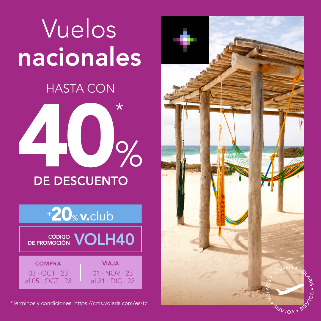 Volaris no ha parado de sorprender a sus usuarios, la empresa ya lleva un par de meses ofreciendo descuentos imperdibles en sus vuelos. Esta tarde dieron una buena noticia a todos los viajeros, pues anunciaron que sus aviones los llevarán a sus destinos favoritos con un 40% de descuento en sus reservaciones.De acuerdo con la información compartida a través de su cuenta de X (antes Twitter) esta promoción es únicamente aplicable en vuelos nacionales, para hacer válido el descuento, tienes como fecha límite de compra el día 05 de octubre del año en curso.Asimismo, informan que para hacer efectivo el 40% de descuento en la compra de tu boleto deberás viajar entre el 01 de noviembre y el 31 de diciembre de 2023.Lo único que debes hacer es ingresar al sitio web oficial de Volaris, seleccionar las fechas de tu viaje e ingresar el código de promoción que aparece en la publicación que compartieron a través de X. YC