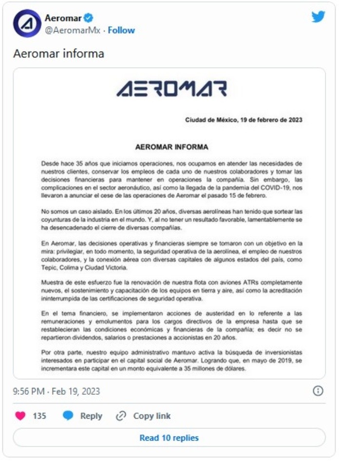 A través de un comunicado emitido en redes sociales, Aeromar detalló algunas de sus estrategias financieras implementadas para evitar el cierre de la empresa, esto luego de que la aerolínea anunció el cese de operaciones el pasado 15 de febrero.La compañía atribuyó este cese a la pandemia por COVID-19 y las "complicaciones en el sector aeronáutico", y aseguró que desde hace más de 35 años se ocupan de atender las necesidades de los clientes, así como mantener los empleos "y tomar decisiones financieras para mantener las operaciones".Detalló que implementaron medidas de austeridad para los cargos directivos en los que no se repartieron dividendos, salarios y prestaciones a los accionistas en 20 años.En el comunicado también se lee que desde hace cuatro años se aceptó la designación de una interventora del Servicio de Administración Tributaria (SAT) para garantizar el pago de adeudos fiscales.Explicó que todos los gastos eran aprobados por la interventora, por lo que en ese periodo se hicieron pagos por más de 130 millones de pesos al SAT.Aeromar señaló que no son un caso aislado de las aerolíneas que han tenido que cerrar en los últimos 20 años a causa de no tener "resultados favorables" en la coyuntura actual de esta industria.El pasado miércoles 15 de febrero, la aerolínea anunció el cese definitivo de sus operaciones debido a una serie de problemas financieros.La situación por la que pasa Aeromar se debe a los adeudos millonarios con pilotos y sobrecargos, arrendadores de aeronaves y con el Gobierno federal, que ocasionaron la cancelación de vuelos en el Aeropuerto Internacional de Ciudad de México (AICM).Una de las deudas más grandes es justamente con el AICM, por más de 500 millones de pesos, aunado a la deuda con Aeropuertos y Servicios Auxiliares de más de 74 millones.JM