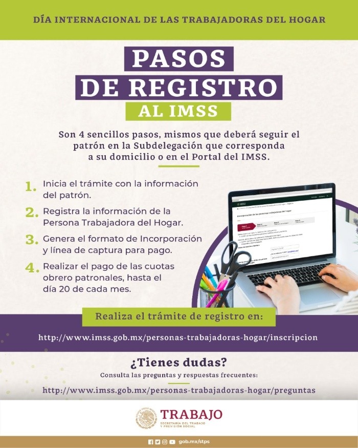 A dos años de haber iniciado la incorporación de las Personas Trabajadoras del Hogar al Instituto Mexicano del Seguro Social (IMSS), se tiene un registro de 27 mil 295 personas. Esto representa una cantidad siete veces más a quienes fueron afiliados bajo la modalidad 34 "Trabajadores Domésticos" en abril de 2019, informó la Secretaría del Trabajo y Previsión Social (STPS). En el marco del Día Internacional de las Personas Trabajadoras del Hogar, celebrado cada 30 de marzo, en conjunto con el IMSS, la STPS recordó que este ramo laboral tienen derecho a los cinco seguros que da el Instituto: de Enfermedades y Maternidad; Riesgos de Trabajo; Invalidez y Vida; Retiro, Cesantía en Edad Avanzada y Vejez; y Guarderías y Prestaciones Sociales."En este sentido, los trabajadores tienen derecho a atención médica, farmacéutica y hospitalaria; pago de incapacidades por enfermedad general o riesgos de trabajo; generar ahorro para el retiro o pensión en caso de invalidez para el asegurado y sus beneficiarios legales; y prestaciones como estancias infantiles y actividades de esparcimiento", señalaron las dependencias.Además, los beneficios se extienden a los miembros de la familia de los trabajadores, donde al mes de febrero se han registrado 22 mil 673 beneficiarios, de los cuales 20 mil 7 son hijos, siete mil 465 cónyuges, concubina o concubinario, y cuatro mil 775 madre o padre, de acuerdo con lo establecido en la ley vigente.Los 27 mil 295 trabajadores fueron afiliados con un salario diario de 210 pesos, informó la Secretaría del Trabajo en un comunicado de prensa, lo cual significa siete veces más que el número de puestos registrados en el esquema anterior en 2019, cuando éste registró un máximo histórico.De acuerdo con la distribución a nivel nacional, el 63% de las Personas Trabajadoras del Hogar laboran en la Ciudad de México, Estado de México, Sonora, Jalisco, Nuevo León, Veracruz, Sinaloa, Coahuila, Baja California Norte y Chihuahua.Dentro de la numeraria de las dependencias, destacaron que, de los más de 27 mil trabajadores del hogar vigentes, el 68% son mujeres de 49 años en promedio, mientras que los hombres representan el 32% en un rango de edad de 54 años."De acuerdo con la Encuesta Nacional de Ocupación y Empleo (ENOE), el 88% de las personas trabajadoras del hogar ganan dos salarios mínimos o menos, respecto a la jornada de trabajo; 42% labora más de 35 horas a la semana; el 96% labora sin contrato y el 69.5% no tiene prestaciones", precisó.Comentó que, por motivo de las condiciones laborales de las Trabajadoras del Hogar, es importante contar con el apoyo de las personas empleadoras, quienes constituyen una pieza fundamental para dignificar las condiciones laborales de este grupo, toda vez que no puede hablarse de trabajo decente si no se cuenta con salarios remuneradores, condiciones de seguridad y salud en el trabajo, sin prácticas discriminatorias, entre otras.NR