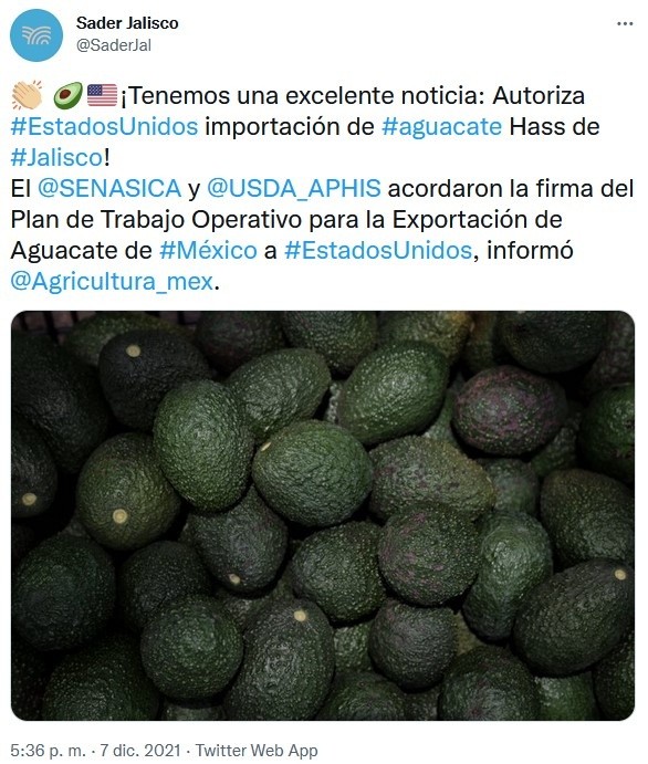 El aguacate Hass producido en Jalisco podrá exportarse a Estados Unidos. Autoridades agrícolas del país vecino autorizaron la su importación para la temporada de cosecha que comenzará en abril de 2022, informó hoy la Secretaría de Agricultura y Desarrollo Rural (Sader).El Servicio Nacional de Sanidad, Inocuidad y Calidad Agroalimentaria (Senasica) y el Servicio de Inspección de Salud Animal y Vegetal (APHIS, por sus siglas en inglés) firmaron el Plan de Trabajo Operativo para la Exportación de Aguacate de México a Estados Unidos, cuyo alcance inicial implica a huertos certificados de Jalisco, indico la Sader en un comunicado.Explicó que los productos de los huertos aprobados en México, producidos y empacados bajo este plan "podrán exportarse a las 50 entidades de Estados Unidos y Puerto Rico".Jalisco es el segundo productor de aguacate en el país, con 248 mil toneladas anuales, luego del estado de Michoacán, con más de 1.8 millones de toneladas. Le sigue el Estado de México, con más de 118 mil toneladas.La Sader y el Departamento de Agricultura de Estados Unidos (USDA) elaboraron el plan de trabajo a solicitud de productores, empacadores y exportadores de aguacate, quienes expresaron su disposición para participar en el programa de exportación y cumplir con lo establecido en el documento.En 1997 se firmó el plan de trabajo para la exportación de aguacate de Michoacán a Estados Unidos, recordó la dependencia, y después de 24 años de trabajo y gracias a la confianza que generó la labor de productores, empacadores, autoridades fitosanitarias y prestadores de servicio, al no detectarse frutos con presencia de plagas, "se logró ampliar la exportación".Agregó que este plan de trabajo permite a los productores interesados de Jalisco comenzar a realizar los trabajos para estar en condiciones de exportar durante la próxima temporada, la cual inicia en abril de 2022."Uno de los requisitos que es necesario cumplir es que las regiones tengan el estatus de zona libre de plagas cuarentenarias conocidas como barrenadores del aguacate, por lo cual, el Senasica prevé que la exportación comenzará con Jalisco y seguirá después con el Estado de México y Nayarit, que son los principales productores de aguacate, después de Michoacán", apuntó el comunicado.La Sader destacó que actualmente está en negociaciones con Brasil, Malasia, China, Corea del Sur, Filipinas, Indonesia, Cuba y Chile, y en breve con Australia y Tailandia, con el fin de abrir más mercados para la fruta mexicana y dijo que México exporta 1,3 millones de toneladas de aguacate a 51 naciones.México es el principal productor de aguacate en el mundo, con un volumen que en 2020 superó 2.3 millones de toneladas, lo que significa el 32 % de la producción mundial de este fruto.Estados Unidos es el principal consumidor de aguacate mexicano, le siguen Canadá, Japón, España, Países Bajos, Francia, Reino Unido, Honduras, El Salvador, China y Corea del Sur, entre otros. IM