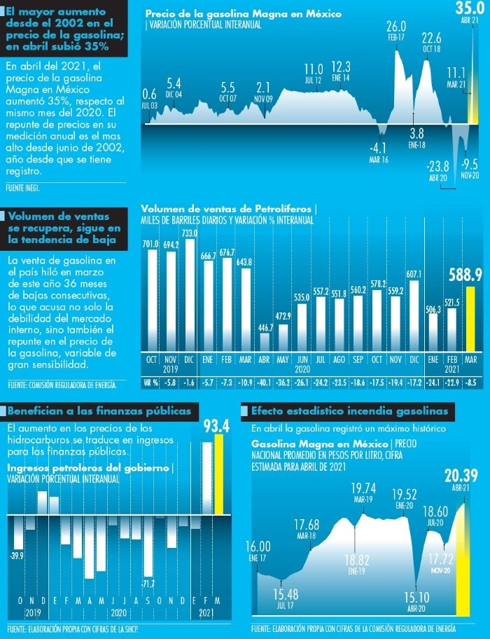 En abril del 2021, el precio de los energéticos en México registró un aumento récord de 28.02%, al interior de éste, el precio de la gasolina Magna acusó un aumento de 35% y la Premium 34.5%, respecto al mismo mes del 2020. De acuerdo con el reporte mensual sobre inflación del Inegi, el repunte de precios en su medición anual es el mas alto desde junio de 2002, año desde que se tiene registro, además, tal aumento es casi seis veces el registrado por la inflación nacional que para el mismo lapso fue de 6.1 por ciento.El explosivo aumento en el precio de la gasolina tiene de fondo el efecto estadístico provocado por la expansión de la pandemia a nivel global, que provocó el cierre masivo de empresas y comercios, paralizando la actividad económica a niveles sin presentes y cuyo primer efecto fue la drástica baja en la demanda de gasolina y con ello en el precio. En abril del 2020, el precio promedio de la gasolina Magna en México cayó hasta los 15.10 pesos por litro, mientras que para abril de 2021, el precio del carburante alcanzó 20.39 pesos por litro, un aumento de 35% en dicho lapso, avance que reflejó también la mejora en las expectativas de recuperación y normalización de la economía global.El aumento récord en el precio de la gasolina tuvo como fondo el crecimiento que se registró en el mercado internacional, pues de acuerdo con las cotizaciones del mercado de commodities de Nueva York, en abril de 2020 el precio promedio de la molécula fue de 0.6668 dólares por galón y para abril del 2021, promedió 1.9888 dólares, es decir, un aumento de 197 por ciento.En México el precio de la gasolina se determina a partir del precio que día a día se establece en el principal mercado de combustibles de Nueva York, es decir, su cotización esta sujeta a las fuerzas de la oferta y demanda, por lo que intervienen en la determinación del precio final a los consumidores mexicanos, la cotización del peso respecto al dólar, que vale decir, tuvo una apreciación de 17.5% en dicho lapso, los costos de la logística, las cargas impositivas, subsidios y márgenes de beneficio para los intermediarios.Así, por primera vez en la historia de la economía mexicana, el aumento récord en el precio de la gasolina no obedece al tradicional desajuste en las cuentas externas o de balanza de pagos, ni a la necesidad de cuadrar el balance fiscal por un déficit inmanejable, en esta ocasión fueron las fuerzas del mercado las que movieron el precio a su nivel mínimo en abril de 2020 y posteriormente un escenario de mejora en la economía reactivaron la planta industrial y el comercio mundial, generando en forma acelerada los empleos perdidos y con ello liberado una demanda reprimida o pospuesta por la emergencia sanitaria.El reporte de finanzas publicas en México reveló que al primer trimestre del año los ingresos petroleros del gobierno habían aumentado 93.4%, respecto al mismo mes del 2020, mientras que en el resultado acumulado para los primeros tres meses del 2021, el aumento fue de 45.6 por ciento. El IEPS acusaba las situaciones cuando aumenta el precio de la gasolina, es decir, una reducción mes a mes del 27.3% y durante el trimestre del 22.4 por ciento.En marzo de 2021, el consumo de gasolina en México hiló 36 meses de bajas consecutivas, al registrar una caída de 8.5% respecto al mismo mes del 2020, sin embargo, el repunte en el precio de la gasolina significó un aumento del 43.9% en términos reales.La venta de gasolina Magna en marzo fue por 452,310 barriles diarios, 13.4% menos que en el mismo mes del 2020, en tanto que de la gasolina Premium, la venta fue por 136 mil 555 barriles diarios, un aumento de 12.2% interanual, con lo que acumuló 10 meses consecutivos de crecimiento en ventasEn este punto cabe recordar que desde junio de 2020 y hasta marzo pasado se cerró el diferencial de precio entre la gasolina de alto y bajo octanaje, que motivó a muchos automovilistas se inclinaran por cargar la de mayor rendimiento, hubo meses en los que el diferencial de precio entre una y otra no superaba los 50 centavos.La paulatina pero sostenida baja en el volumen de ventas de gasolinas en México, tocó fondo en abril del 2020, con la venta de 447,155 de barriles, una baja de 40%, respecto al mismo mes del 2019, para los siguiente meses, se observó una moderada recuperación en el consumo de gasolina, sin embargo, para diciembre de 2020, la incipiente tendencia de recuperación en el consumo de gasolina se vio interrumpida por el rebrote de contagios por Covid-19, en ese mes, la caída del 17.2 por ciento.En términos de valor, destacan las ventas de marzo, con un aumento del 43.9% en términos reales, respecto al mismo mes del 2020. La venta de gasolina Magna, la de mayor consumo, aumentó 38.4% y la Premium 64.7%, con lo que hiló nueve meses consecutivos de alza.