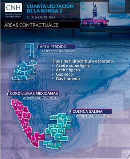 La Comisión Nacional de Hidrocarburos (CNH) realiza la Apertura de Propuestas de la Cuarta Licitación de la Ronda 2 que se encuentra integrada por 29 áreas contractuales bajo la modalidad de Contrato de Licencia. Estas áreas contractuales se encuentran en las provincias petroleras de: Área Perdido, Cordilleras Mexicanas y Cuenca Salina.