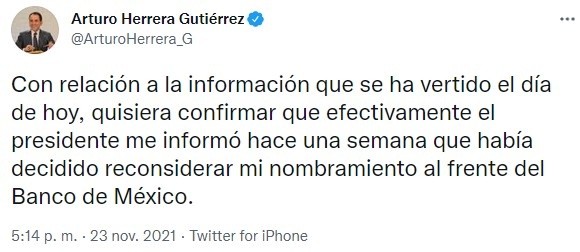 Arturo Herrera, exsecretario de Hacienda, reaccionó esta tarde a la información sobre que el Gobierno de Andrés Manuel López Obrador (AMLO) retiró, sin explicación, la propuesta que había enviado al Senado para nombrarlo nuevo gobernador del Banco de México."Con relación a la información que se ha vertido el día de hoy, quisiera confirmar que efectivamente el presidente (López Obrador) me informó hace una semana que había decidido reconsiderar mi nombramiento al frente del Banco de México", dijo Herrera en sus redes sociales.El senador Ricardo Monreal afirmó previamente que el Ejecutivo retiró el nombramiento de Herrera desde agosto."Desde agosto la oficina del Ejecutivo retiró el nombramiento y nosotros no hacemos otra cosa sino aceptar la decisión", dijo Monreal, líder de Morena en el Senado.El pasado 9 de junio, López Obrador anunció la salida de Herrera como secretario de Hacienda, para postularlo como gobernador del Banco de México.Herrera fue sustituido días después por Rogelio Ramírez de la O al frente de la Secretaría de Hacienda.La postulación de Herrera, quien tiene buena relación con el sector empresarial, tranquilizó al sector privado luego de la inquietud que generó López Obrador al anunciar que propondría a un "economista con dimensión social".Herrera fue el encargado de consolidar el plan de austeridad encargado por López Obrador, con recortes en fideicomisos de ciencia, medioambiente, cultura y salud, así como de evitar el endeudamiento del país a toda costa.Herrera, quien actualmente imparte clases en el Colegio de México, dijo que al dejar el Gobierno que afrontó "la crisis económica más severa desde la Gran Depresión" mitigando los efectos a los "más vulnerables" y cuidando "los equilibrios macroeconómicos".IM