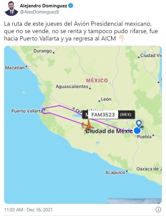 El avión presidencial TP01 del Gobierno mexicano, en venta desde hace tres años, salió a volar este jueves y se ubicó sobre Puerto Vallarta, Jalisco.Según datos de la plataforma digital de rastreo de vuelos Flight Radar, el Boeing 787 Dreamliner despegó antes de las 10:00 de la mañana del Aeropuerto Internacional de la Ciudad de México (AICM).El avión presidencial se desplazó por el espacio aéreo hasta Puerto Vallarta y regresó a la capital del país. En total, el vuelo fue de alrededor de 2 horas.En redes sociales se compartió la ruta del Boeing 787 Dreamliner.La última vez que el TP01 "José María Morelos y Pavón" realizó un vuelo de mantenimiento fue el pasado 15 de octubre, cuando sobrevoló el Golfo de México y después se dirigió a Mérida, Yucatán, en un viaje de ida y vuelta a la Ciudad de México.En julio pasado, trasladó instrumentos deportivos de atletas mexicanos a Tokio, para los Juegos Olímpicos.Desde el inicio de su administración en 2018, el Presidente Andrés Manuel López Obrador busca vender el avión, que actualmente permanece en Ciudad de México.IM