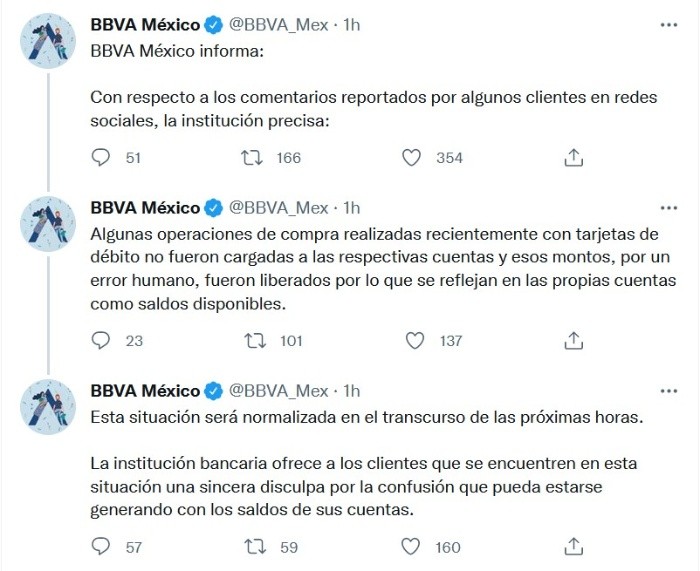 Luego de que usuarios de redes sociales reportaran supuestos depósitos desconocidos a sus cuentas, el banco BBVA dijo que se debió a "un error humano".A través de Twitter, la institución bancaria dijo que algunas compras con tarjetas de débito no fueron cargadas a las respectivas cuentas, por lo que "esos montos, por un error humano, fueron liberados por lo que se reflejan en las propias cuentas como saldos disponibles".Asimismo, BBVA aclaró que la situación será normalizada en el transcurso de las próximas horas."La institución bancaria ofrece a los clientes que se encuentren en esta situación una sincera disculpa por la confusión que pueda estarse generando con los saldos de sus cuentas", concluyó.Por medio de redes sociales, internautas aseguraron haber recibido dinero a sus cuentas, por lo que se manifestaron con memes; sin embargo, no todos los clientes del banco corrieron con la misma suerte.JM