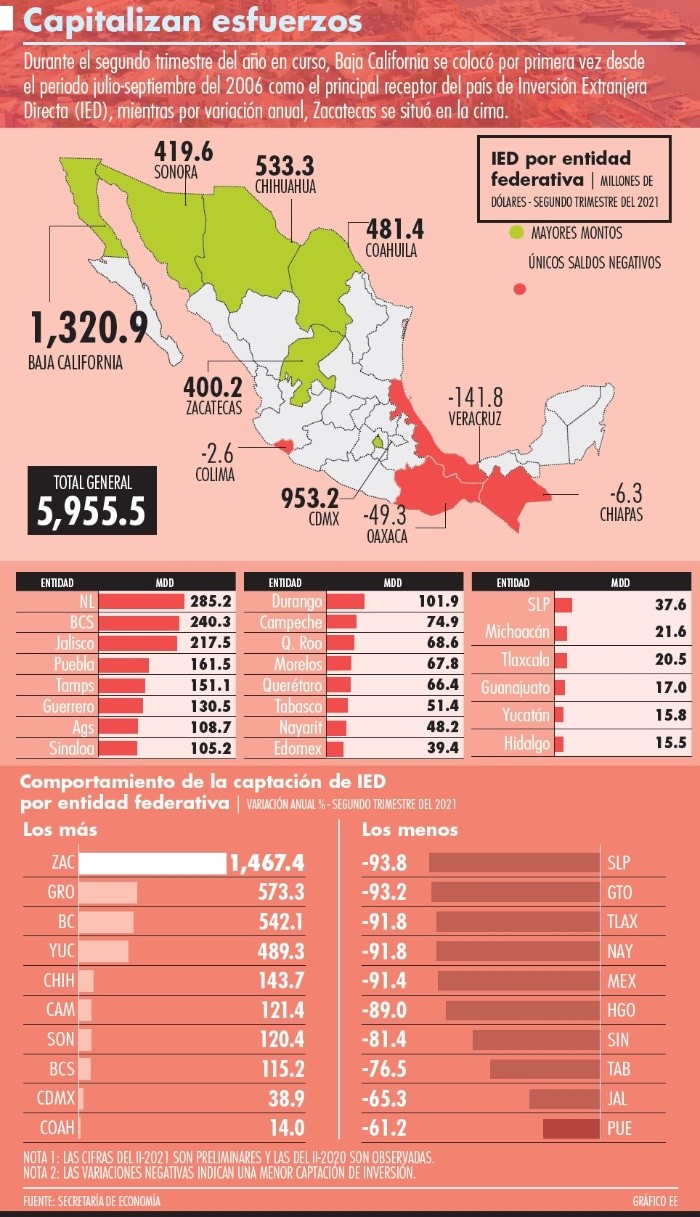 Durante el segundo trimestre del año en curso, Baja California se colocó por primera vez en los últimos 15 años como el principal receptor del país de Inversión Extranjera Directa (IED).Ésta es la segunda ocasión que la entidad fronteriza se ubica en primer lugar nacional. La primera vez fue en el periodo julio-septiembre del 2006, cuando captó 328.1 millones de dólares, mientras esta hazaña la logró nuevamente en el lapso abril-junio del 2021, con una atracción de mil 321 millones de capital extranjero, de acuerdo con datos de la Secretaría de Economía.Además, este último monto representó un crecimiento de 542.1% a tasa anual (el dato del primer trimestre de este año es preliminar; los demás son observados). Lo importante es que de los mil 321 millones de dólares que atrajo de IED baja California, 81.1% corresponde a nuevas inversiones, situación que manifiesta certidumbre y confianza hacia el estado de los capitales foráneos. Por su parte, 18.1% se refiera a cuentas entre compañías y 0.8%, a reinversión de utilidades.Por país, mil 240 millones de dólares provino de Estados Unidos, 495.1% más que en el segundo trimestre del 2020, lo que se traduce en la materialización de la economía binacional con California; el segundo lugar fue para Corea con 63 millones, que significó un incremento anual de 160.3 por ciento.En tanto, la rama económica que dio este impulso positivo para la entidad de la frontera norte de México fue transporte de gas natural por ductos, con mil 006 millones de dólares de inversión. Otros resultados importantes se observaron en fabricación de productos de plástico (39 millones); fabricación de instrumentos de medición, control, navegación y equipo médico electrónico (25 millones); fabricación de aparatos eléctricos de uso doméstico (24 millones) y fabricación de automóviles y camiones (20 millones).La política estatal de atracción de inversión extranjera se reflejó en la creación de empleos formales, ya que Baja California fue el mayor generador con 65 mil 203 plazas laborales entre julio del 2021 y febrero del 2020 (nivel prepandemia), según información del Instituto Mexicano del Seguro Social (IMSS).Asimismo, la primera entidad en superar los estragos que trajo consigo el COVID-19 en el mercado laboral fue Baja California, en agosto del 2020, con 3 mil 790 nuevos puestos asegurados en el IMSS, respecto a febrero del mismo año, y considerando que al inicio de junio terminó la jornada nacional de sana distancia para evitar la propagación del virus (abril y mayo fueron de total confinamiento y paro de actividades no esenciales).Los otrosTras Baja California, los mayores receptores de IED en el segundo trimestre del presente año fueron Ciudad de México (953 millones de dólares), Chihuahua (533 millones), Coahuila (481 millones), Sonora (420 millones) y Zacatecas (400 millones). Mientras los menores montos fueron en Guanajuato (17 millones), Yucatán (16 millones) e Hidalgo (15 millones).Sobresale que cuatro estados mostraron saldos negativos: Colima (-3 millones de dólares), Chiapas (-6 millones), Oaxaca (-49 millones) y Veracruz (-142 millones).En el caso veracruzano, la merma provino de cuentas entre compañías (-216 millones de dólares), cuyo flujo negativo se debe a préstamos de las filiales a las matrices en el exterior y/o adelantos de pagos de filiales a sus matrices. Los saldos positivos fueron en reinversión de utilidades (19 millones) y nuevas inversiones (56 millones).DestacadosPor variación anual, 12 entidades presentaron incrementos, 13 redujeron su ritmo de captación de IED en el segundo trimestre del 2021, tres repuntaron (Aguascalientes, Morelos y Tamaulipas) y cuatro tuvieron saldos negativos, cuando un año antes eran positivos (no se pueden realizar tasas de crecimientos entre cifras negativas y positivas). Los mayores aumentos en inversión extranjera fueron en Zacatecas y Guerrero.Si te interesó esta noticia y quieres saber más, entonces descarga y descubre INFORMAPlus, la aplicación digital de EL INFORMADOR, en donde tenemos contenidos exclusivos, seleccionados por nuestros editores, para darles una experiencia más completa a los lectores.Descarga la aplicación y pruébala GRATIS por treinta días.Para iOS: https://apple.co/35jaVgb Para Android: https://bit.ly/3gwVSEVSi eres suscriptor de EL INFORMADOR tu acceso está incluido, solicítalo al 33 3678-7777.