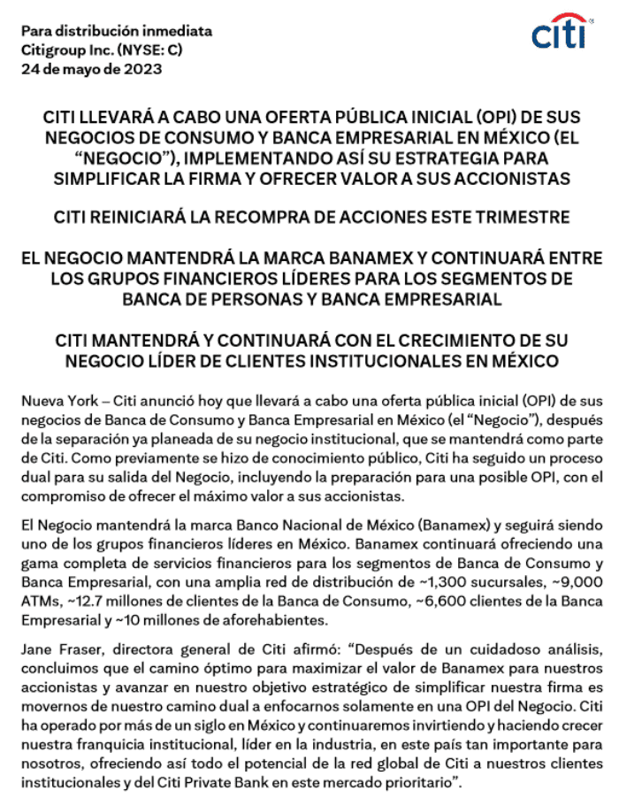 Germán Larrea, empresario mexicano y dueño de Grupo México, finalmente se quedó sin el Banco Nacional de México (Banamex), luego de que el grupo internacional bancario Citi anunciara esta mañana que conservará el banco; noticia que se dio a conocer desde Nueva York."Citi anunció hoy que llevará a cabo una oferta pública inicial (OPI) de sus negocios de Banca de Consumo y Banca Empresarial en México, después de la separación ya planeada de su negocio institucional, que se mantendrá como parte de Citi. Como previamente se hizo de conocimiento público, Citi ha seguido un proceso dual para su salida del Negocio, incluyendo la preparación para una posible OPI, con el compromiso de ofrecer el máximo valor a sus accionistas", declaró el corporativo en un anuncio global.Citi "mantendrá la marca Banco Nacional de México (Banamex) y seguirá siendo uno de los grupos financieros líderes en México. Banamex continuará ofreciendo una gama completa de servicios financieros para los segmentos de Banca de Consumo y Banca Empresarial, con una amplia red de distribución de mil 300 sucursales, nueve mil cajeros automáticos, 12.7 millones de clientes de la Banca de Consumo, seis mil 600 clientes de la Banca Empresarial y 10 millones de aforehabientes", agregó.En el comunicado también se señaña que Jane Fraser, directora general de Citi, afirmó: "Después de un cuidadoso análisis, concluimos que el camino óptimo para maximizar el valor de Banamex para nuestros accionistas y avanzar en nuestro objetivo estratégico de simplificar nuestra firma es movernos de nuestro camino dual a enfocarnos solamente en una OPI del Negocio. Citi ha operado por más de un siglo en México y continuaremos invirtiendo y haciendo crecer nuestra franquicia institucional, líder en la industria, en este país tan importante para nosotros, ofreciendo así todo el potencial de la red global de Citi a nuestros clientes institucionales y del Citi Private Bank en este mercado prioritario".OA