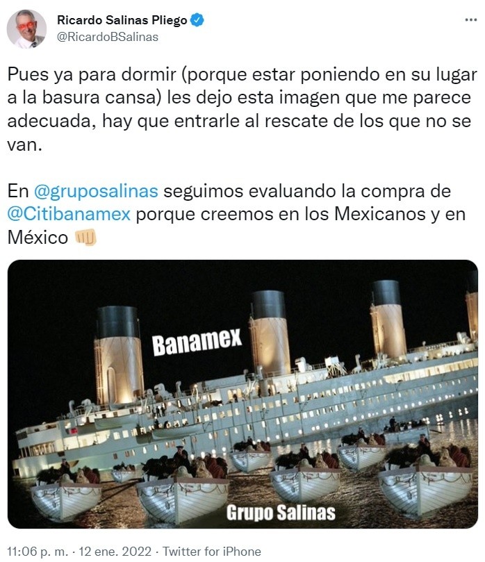 Luego de que se dio a conocer la venta de Banamex y que el empresario Ricardo Salinas Pliego mostró su interés en hacer la compra, el secretario de Gobernación, Adán Augusto López, expresó que quienes tengan posibilidad de participar en la operación pueden hacerlo."Yo creo que todos los mexicanos, incluso los extranjeros, personas privadas o personas morales pueden, en el ejercicio de sus derechos, participar en una propuesta para comprar, en este caso lo que refiere de Citibanamex"."Qué bueno que México sea un país de libertades y que todos quienes tengan posibilidad de participar en una operación de este tipo puedan hacerlo", dijo Adán Augusto López en la conferencia "mañanera" de este jueves en Palacio Nacional, en sustitución del Presidente Andrés Manuel López Obrador (AMLO), quien se recupera de COVID-19.El empresario Ricardo Salinas Pliego informó que pidió a su equipo analizar la conveniencia de comprar Banamex luego del anuncio por parte de Citi de poner a la venta el negocio minorista, la marca, Afore y otros activos."Yo siempre he creído e invertido en México y los Mexicanos. Por eso le he pedido a mi equipo analizar la conveniencia de adquirir Citibanamex y redoblar mi apuesta en México, los Mexicanos y su futuro", dijo el empresario en redes sociales.Varios de los seguidores del empresario, quien es propietario de Banco Azteca, pidieron que analizara la posibilidad de adquirir a Banamex, ante lo cual respondió en un principio con algunos "memes", pero Ricardo Salinas Pliego reiteró que mientras otras empresas se van de México, él mantiene sus negocios en el país."Ellos se van y nosotros nos quedamos con los mexicanos porque creemos en ustedes. Que me digan cuanto por su changarrito y vemos, ya se parecen a BestBuy", dijo el empresario.OA