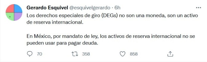 El subgobernador del Banco de México (Banxico), Gerardo Esquivel, dijo que los Derechos Especiales de Giro (DEG) que le corresponderían a México con la nueva asignación que aprobó el Directorio Ejecutivo del Fondo Monetario Internacional (FMI), no se pueden usar para pagar deuda pública."Los derechos especiales de giro (DEGs) no son una moneda, son un activo de reserva internacional", señaló en su cuenta de Twitter.Explicó que en México, por mandato de ley, los activos de reserva internacional no se pueden usar para pagar deuda.Lo anterior en respuesta a los comentarios que hizo el Presidente Andrés Manuel López Obrador (AMLO) sobre el tema: "Van a otorgar créditos a tasas bajas por 650 mil millones de dólares, en el caso de México, le corresponden alrededor de 12 mil millones de dólares. Nosotros podríamos utilizar esos recursos para pagar deuda por anticipado", dijo.En cambio, para el presidente del Instituto Mexicano de Ejecutivos de Finanzas (IMEF), Ángel García-Lascurain, es una buena idea."El acceder a ellos para pagar deuda nos parece que es correcto, es una vía correcta para poder acceder a los recursos", afirmó en conferencia virtual en la que exhortaron a las autoridades fiscales a agilizar trámites ante el fisco y el pago de devoluciones de impuestos.Consideró que eso permitiría ya sea reducir el saldo absoluto de la deuda que fortalece a la economía federal, pero también podría ser un camino para liberar liquidez y recursos que estuvieron previamente etiquetados para el pago de esa parte de la deuda. "Nos parece que es una ruta correcta para acceder a ellas", consideró.Si te interesó esta noticia y quieres saber más, entonces descarga y descubre INFORMAPlus, la aplicación digital de EL INFORMADOR, en donde tenemos contenidos exclusivos, seleccionados por nuestros editores, para darles una experiencia más completa a los lectores. Si eres suscriptor de EL INFORMADOR tu acceso está incluido, solicítalo al 33 3678-7777Descarga la aplicación y pruébala GRATIS por treinta días.Para iOS: https://apple.co/35jaVgbPara Android: https://bit.ly/3gwVSEVJM