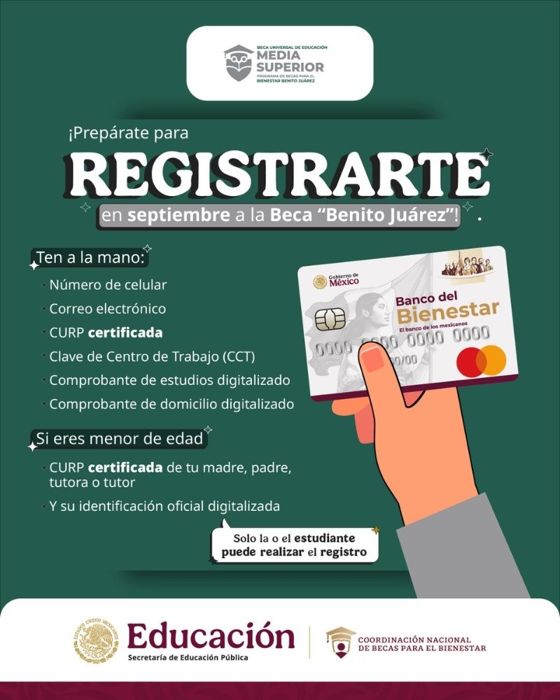 La Beca Benito Juárez es un apoyo impulsado por el Gobierno de México y la Coordinación Nacional de Becas para el Bienestar, destinado a los alumnos de nivel medio superior con la finalidad de que continúen sus estudios de manera satisfactoria.Por este motivo, durante el próximo ciclo escolar continuará la dispersión de las tarjetas para que miles de estudiantes de escuelas públicas reciban bimestralmente la cantidad de $1,900 pesos.Tras la llegada del ciclo escolar 2025-2026, los registros para tramitar la Beca Benito Juárez se abrirán durante el mes de septiembre, por lo que la iniciativa invitó a los jóvenes que desean incorporarse al programa, a reunir los documentos necesarios y tener a la mano los siguientes datos. A continuación te diremos cuales son.*Mantente al día con las noticias, únete a nuestro canal de WhatsApp aquí: https://whatsapp.com/channel/0029VaAf9Pu9hXF1EJ561i03 MV