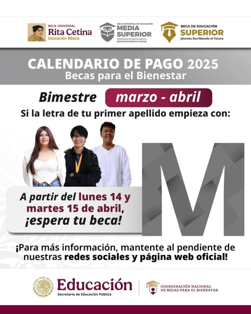 Desde el 1 de abril iniciaron los pagos de las Becas para el Bienestar en sus tres niveles educativos, correspondientes al bimestre marzo-abril de este año.Si tú —estudiante, tutor, padre o madre de familia— ya cuentas con tu respectiva tarjeta del Banco del Bienestar ya sea para la Beca Rita Cetina, Beca Universal de Educación Media Superior Benito Juárez o para la Beca de Educación Superior Jóvenes Escribiendo el Futuro, recibirás durante este mes tu pago.Respecto a la Beca Rita Cetina, que beneficia a alumnas y alumnos de educación básica, incluida la secundaria de forma universal, entrega 1,900 pesos bimestrales por familia, más 700 pesos adicionales por estudiante en caso de tener a dos o más en secundaria.Estos pagos se realizarán de acuerdo con la letra inicial del primer apellido de los beneficiarios.Para este martes 15 de abril de 2025, los apellidos que comiencen con la letra "M" recibirán su pago, al igual que el de este lunes. De acuerdo con las redes sociales oficiales de las becas: Es importante que sepas que no es necesario retirar el dinero el mismo día del depósito, ya que permanece seguro en tu cuenta del Banco del Bienestar, y también puedes utilizar tu tarjeta en cualquier establecimiento que acepte pagos de este tipo.Si tienes hijos o hijas en secundaria y aún no recibes tu tarjeta para la Beca Rita Cetina, no te preocupes; la entrega de tarjetas continúa en las secundarias de todo el país y pronto te avisarán en la escuela cuándo debes ir a recogerla para recibir luego los pagos retroactivos desde enero.*Mantente al día con las noticias, únete a nuestro canal de WhatsApp aquí: https://whatsapp.com/channel/0029VaAf9Pu9hXF1EJ561i03 MV