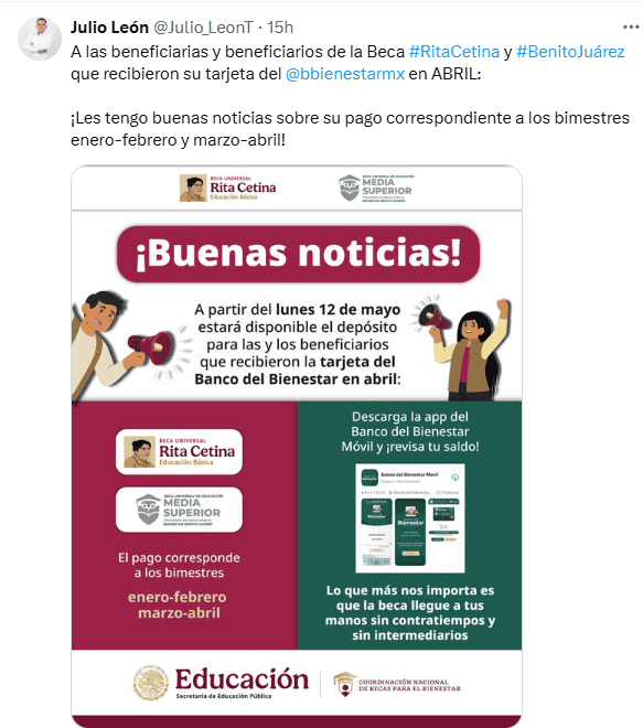 Uno de los nuevos programas sociales implementados durante la administración de la Presidenta Claudia Sheinbaum Pardo se trata de la Beca Rita Cetina, la cual está dirigida a todos los alumnos de educación básica del país que estén inscritos en planteles públicos.A través de la entrega de un monto de mil 900 pesos por alumno, más 700 adicionales por cada estudiante de la misma familia inscrito en el mismo nivel educativo, la beca pretende reducir los niveles de deserción escolar.Julio León, Coordinador Nacional de Becas para el Bienestar, informó a través de una publicación en su cuenta de X (antes Twitter) que los beneficiarios que recibieron su tarjeta del Banco del Bienestar en abril verán reflejados este mes el monto de dos pagos, correspondientes a los bimestres enero-febrero y marzo-abril.De acuerdo con el mensaje, la dispersión de recursos para estos estudiantes comenzó el día de ayer, lunes 12 de mayo.Para saber si el dinero ya se encuentra disponible en la tarjeta, muchas personas utilizan el Buscador de Estados, sin embargo, en este momento se encuentra en mantenimiento, por ello, aquí te compartimos otros métodos:Cabe señalar que, de acuerdo con la información emitida por las autoridades, este mismo año se pretende ampliar la cobertura para los alumnos de primaria y preescolar. Para conocer las fechas de registro, los interesados deben quedar al pendiente de los canales oficiales. * * * Mantente al día con las noticias, únete a nuestro canal de WhatsApp * * *MB