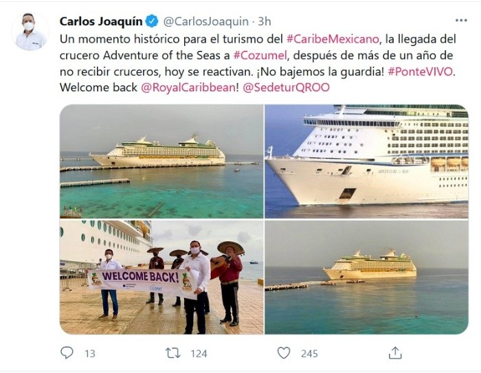 La isla de Cozumel dio la bienvenida el miércoles al primer crucero desde que la pandemia de coronavirus prácticamente colapsó la industria turística.Funcionarios del estado de Quintana Roo dieron la bienvenida al Adventure of the Seas, de la línea Royal Caribbean, que llegó procedente de Nassau, en Las Bahamas, a una de las escalas más concurridas del mundo para cruceros.La línea de cruceros requiere que todo pasajero mayor de 16 años esté completamente vacunado contra el COVID-19. El resto deberá realizarse una prueba médica.El gobernador de Quintana Roo, Carlos Joaquín, dijo que un 5% de los pasajeros —unos 150 jóvenes o aquellos con enfermedades crónicas— no han sido vacunados y que estarían sujetos a reglas especiales. Funcionarios de salud estatales y federales supervisaron la llegada."La empresa propuso que el grupo de no vacunados únicamente pueda desembarcar con la contratación de excursiones con protocolos de burbujas sanitarias, no a cualquier lugar", dijo Joaquín. "Como pueden ver, son condiciones muy estrictas que traen estos cruceros".La línea de cruceros promovió el viaje como "una oportunidad de aventurarse en la historia maya durante una visita a Cozumel".Quintana Roo alberga complejos turísticos como Cancún, Playa del Carmen y Tulum; la actividad económica estatal depende en un 87% del turismo.La secretaria estatal de Salud, Alejandra Aguirre, escribió sobre la llegada del crucero: "Trabajamos unidos en la reactivación ordenada de la actividad económica. Haz tu parte".Sin embargo, el destino no pareció sonreír sobre el regreso de los cruceros: este miércoles amaneció muy lluvioso y había cantidades significativas de sargazo en muchas de las playas del estado.México no pide prueba de coronavirus para los pasajeros que llegan, y la evidencia anecdótica sugiere que los turistas se sienten atraídos por los complejos turísticos del Caribe mexicano en parte porque no ha habido cierre y porque las precauciones de salud son en gran parte voluntarias. Muchos visitantes se quitan sus mascarillas cuando llegan a sus hoteles o clubes de playa.JM