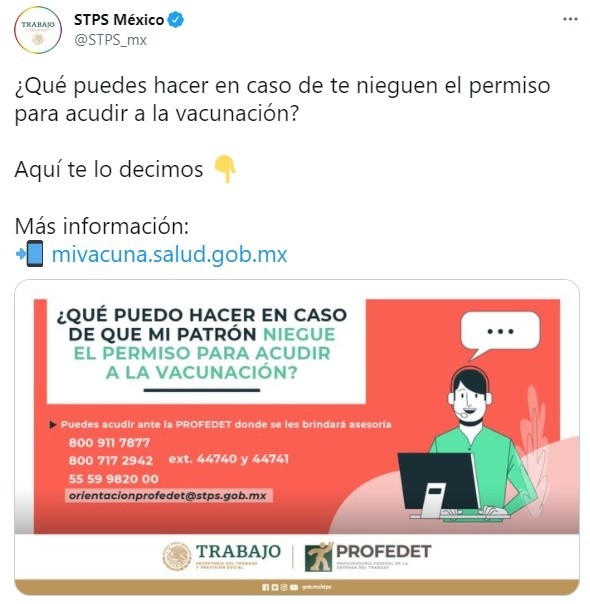 Según datos del Instituto Nacional de Estadística y Geografía (Inegi) la población en edades entre los 30 y 49 años de edad conforma el grupo más grande de personas trabajadoras y son los precisamente quienes han comenzado a registrarse para recibir próximamente su vacuna contra el COVID-19, pero sienten el temor de faltar a sus empleos ya que no tienen certeza de que haya un permiso oficial al respecto.Es por eso que la Secretaría del Trabajo y Previsión Social (STPS) advierte a las empresas que no pueden negarle el permiso a nadie para acudir a estas citas de vacunación, de hecho en la fracción XIX Bis del artículo 32 de la Ley Federal del Trabajo se menciona que es obligación de las empresas "cumplir con las disposiciones que en caso de emergencia sanitaria fije la autoridad competente".Incluso en ese mismo apartado se menciona que las empresas deben proporcionar a sus trabajadores los elementos que señale dicha autoridad, para prevenir enfermedades en caso de declaratoria de contingencia sanitaria.Con este apartado, las empresas no podrán legalmente negar el acceso programado del esquema de vacunación, señala una comunicación de la STPS, encabezada por Luisa María Alcalde. No pueden hacerlo porque "la salud de los trabajadores es de interés público", conforme al artículo 132 de la LFT y al 408 de la Ley General de Salud (LGS).Agregando que también resulta ilegal si te descuentan una parte proporcional de tu salario por esta ausencia.Si consideras que tu patrón no respetó lo anterior, puedes presentar tu denuncia ante la Procuraduría Federal de la Defensa del Trabajo (PROFEDET) en el siguiente LINK https://procuraduriadigital.stps.gob.mx/reporte-trabajador OA