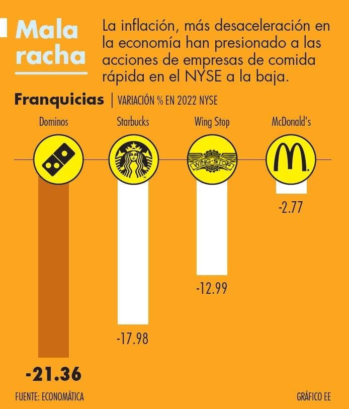 Las acciones de las principales cadenas de comida rápida que cotizan en la Bolsa de Nueva York recienten la inflación, desaceleración económica y nuevos contagios por ómicron este año, además de enfrentarse a los costos de envío a domicilio que representó el cierre de comercios durante el 2020.La mayor pérdida este año en Bolsa la registra Domino´s Pizza, que cotiza en un precio por acción de 443.79 dólares, esto es una caída de 21.36 por ciento. Tras haberse beneficiado por la reapertura económica y por su buen servicio de envío a domicilio que desde antes de la pandemia ya estaba establecido, ahora resiente los daños de la alta inflación.En contraste, durante el 2021 sus títulos subieron 47.17 por ciento.La segunda empresa más rezagada es Starbucks. Las acciones de la cadena de cafeterías tienen un precio de 95.94 dólares en Wall Street y en el 2022 pierden 17.98 por ciento. De hecho, la emisora presentó sus resultados al cuarto trimestre del 2021, y pese a las utilidades, los aumentos de precios de insumos pesaron en su resultado.Fuera de Estados Unidos, Starbucks vio una demanda más débil. En China, su segundo mercado más grande, las ventas se redujeron 14% en el trimestre debido a que el país asiático volvió a imponer restricciones de viaje en algunas ciudades al enfrentar otra ola de casos de coronavirus.La caída de Starbucks borra por completo sus ganancias en el 2021, ya que fue de solo 9.34% en la Bolsa de Nueva York.La franquicia de alitas de pollo preparadas, Wingstop, tiene una caída este año de 12.99% en el precio de sus acciones que se venden en 150.36 dólares. Esta pérdida contrasta con las ganancias de 30.37% que obtuvo el año pasado.La cadena de hamburguesas McDonald´s tiene una caída en lo que va del 2022 de 2.77%, cotizando sus acciones en 260.64 dólares. La emisora terminó el año pasado con un alza de 24.93 por ciento.De hecho, McDonald’s terminó el 2021 con ingresos por 23 mil 222 millones de dólares, un 21% por encima de los 19 mil 207.8 millones en que cerró el 2020.Alberto Carrillo, analista en Signum Research, explicó que “el tema de la pandemia les impactó por el menor tráfico de clientes, debido al confinamiento social que implementaron en varios países. Aunque, las disrupciones de la economía y los efectos de la cadena de suministros, ocasionaron inflación, impactando negativamente en los márgenes de estas compañías”.
