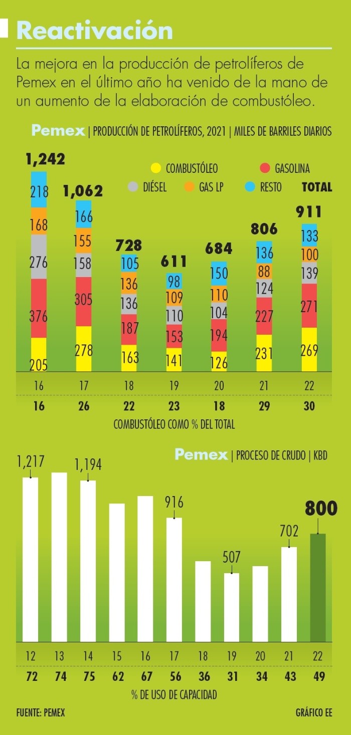 Petróleos Mexicanos (Pemex) reportó un volumen de proceso de crudo de 799 mil 935 barriles diarios, que es el más alto para el primer mes del año desde el 2017 y representó un incremento anual de 13.9%, según su Base de Datos Institucional, lo que le permitió aumentar el volumen de producción de combustibles, incluido el combustóleo que ha generado polémica en torno a su uso por parte de la Comisión Federal de Electricidad (CFE) para generación termoeléctrica.Este volumen de proceso significó una utilización de 48.8% de la capacidad instalada en las refinerías, misma que en enero de 2021 fue de 42.8% y que había bajado hasta 34% en el mismo mes del 2020 y hasta 30.9% en el 2019.Por refinería, Cadereyta, Nuevo León, tuvo una utilización de 34.6%, misma que descendió en comparación con el uso de 45.4% del año anterior.En la refinería de Madero, Tamaulipas, se logró un uso de 49.9% de la capacidad, misma que en 2021 fue de 46.5% y que en enero de 2018 incluso llegó a cero.Minatitlán, Veracruz, reportó un uso de la capacidad de 36.7%, incrementándose en más de 10 puntos porcentuales en relación con el uso de 26.7% del año anterior.Salamanca, Guanajuato, donde se han llevado a cabo procesos de rehabilitación, tuvo un uso de 60.1% de la capacidad instalada, en contraste con el 42.6% del año pasado.En tanto, Salina Cruz, Oaxaca, reportó un uso de 56.4% de su capacidad, aumentando desde 52.1% en enero del 2021.Finalmente, Tula, Hidalgo, reportó un uso de 54.6% en comparación con el 43.5% del año pasado.La última meta que ha planteado el gobierno en torno al proceso de crudo y el uso de la capacidad instalada de las refinerías actuales fue de llegar a 1.375 millones de barriles diarios, utilizando el 86% de su capacidad.Más combustóleoGracias a un mayor uso de la capacidad instalada y a más proceso de crudo, la producción de todos los petrolíferos que se elaboran en el país fue de 911 mil barriles diarios, con un incremento de 12% en relación con el mes de diciembre. En comparación con la elaboración de estos productos en el primer mes del 2021, el incremento es de casi 13%, luego de que añadió 104 mil barriles diarios al reporte de producción de petrolíferos.En lo que respecta a gasolinas, que son el 30% del total de combustibles que produce Pemex, el reporte de las Estadísticas Petroleras del mes de enero detalló que se llegó a una elaboración de 271mil 200 barriles por día, volumen que resulta el más alto para un mes desde el 2016.En contraste con diciembre, Pemex produjo 6.1% más gasolinas de todos los tipos y en comparación con enero del año pasado, incrementó su elaboración de gasolinas en 19% añadiendo 44 mil 300 barriles diarios a su producción.Así mismo, la producción de diésel aumentó ligeramente, en 1%, en comparación con el mes anterior, llegando a 138mil 500 barriles diarios en enero, aunque en comparación con el mismo mes del año pasado el incremento fue de 11.5% en la elaboración de este combustible.Pero como consecuencia del incremento en la elaboración de estos combustibles ligeros, la producción de combustóleo fue de 268 mil 800 barriles diarios, la más alta para un mes desde septiembre del año pasado, luego de que mostró un incremento mensual de 27% y un aumento anual de 16 por ciento.En la actual discusión de la reforma a la Constitución para fortalecer a la Comisión Federal de Electricidad se ha denunciado la necesidad de que la estatal eléctrica sirva como vehículo para quemar el combustóleo de Pemex al aumentar su participación en la generación de energía, ya que cada vez resulta más difícil para la petrolera colocarlo en mercados internacionales.NUMERLIA1 mil 375 millones de barriles de crudo procesado es la meta de corto plazo de Pemex.86% es el uso de capacidad meta de Pemex en su actual sistema de seis refinerías.