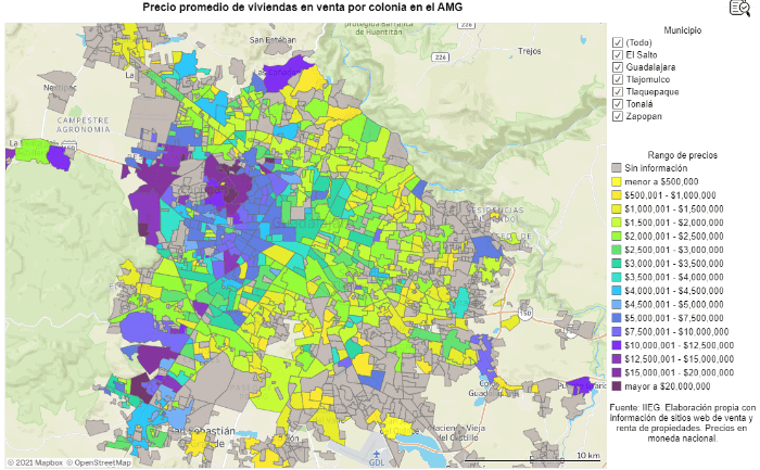Si en tus propósitos de Año Nuevo está comprar una casa propia, debes saber que el Instituto de Información Estadística y Geográfica de Jalisco (IIEG) cuenta con una herramienta para monitorear los precios de venta y renta de viviendas en el Área Metropolitana de Guadalajara.La herramienta recolecta información de distintos sitios web de bienes raíces para tener una radiografía de la oferta de vivienda en los diferentes municipios más importantes que conforman la metrópoli (Guadalajara, Zapopan, El Salto, Tlajomulco, Tlaquepaque y Tonalá).De acuerdo a la herramienta, actualmente existen en total más de 16 mil 800 propiedades en venta en el Área Metropolitana de Guadalajara, de las cuales es el municipio de Zapopan quien concentra el mayor número de opciones con nueve mil 302.Según el reporte actualizado a noviembre de 2020, el precio promedio de una propiedad en el Área Metropolitana de Guadalajara es de 5.9 millones de pesos.Zapopan es el municipio donde se registran los precios más altos de casas en venta, con un promedio de poco más de siete millones de pesos; mientras que en Guadalajara el promedio es de 5.3 millones de pesos por una vivienda.En el extremo opuesto, el precio promedio más bajo para comprar una casa se registra en Tonalá, donde se puede adquirir una propiedad en 1.7 millones de pesos; aunque cabe mencionar que el precio mínimo registrado en la plataforma es de propiedades con un valor de 250 mil pesos en El Salto y Tlaquepaque. La plataforma del IIEG sobre el sector inmobiliario también cuenta con un mapa de colonias que proporciona un panorama más detallado de la oferta de vivienda en la ciudad. En el condominio Zotogrande, ubicado sobre la avenida Acueducto frente al templo de San Juan Macías, se ofertan 10 propiedades cuyo valor máximo es de más de 94 millones de pesos.En Colinas de San Javier, también en Zapopan, hay registro de 27 propiedades en venta con un costo máximo de casi 80 millones de pesos.La plataforma tiene registro de tres propiedades en venta por menos de 500 mil pesos que se ubican en El Salto, Tlaquepaque y Tonalá.De éstas, la más barata está en la colonia San Francisco de Tonalá, por la autopista a Zapotlanejo, casi frente a la Nueva Central Camionera y tiene un precio publicado de 351 mil 186 pesos.Le sigue una propiedad en el fraccionamiento Cima del Sol, de Tlajomulco, con un costo anunciado de 400 mil pesos.Y por último, la tercera propiedad más barata de la metrópoli está en la colonia San José del 15, en El Salto, con un precio de 450 mil pesos.La plataforma del IEEG fue actualizada en noviembre de 2020 y está disponible al público en el sitio web iieg.gob.mx