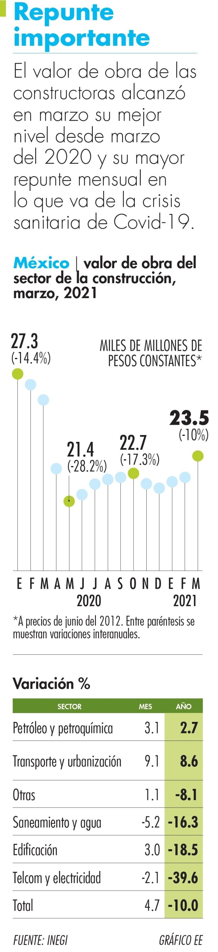 El valor de producción de las empresas de la construcción presentó durante marzo un crecimiento de 4.7%, respecto al mes previo.Se trata del mayor aumento desde la abrupta caída de 20.8% en abril del 2020, cuando se paralizó el país a consecuencia de la pandemia del COVID-19, con lo que su caída anual fue del 10%, según reportó el Instituto Nacional de Estadística y Geografía (Inegi).“El personal ocupado total registró un incremento del 1.2% y las horas trabajadas avanzaron el 2.9%, mientras que las remuneraciones medias reales descendieron el 1.4% en marzo del 2021 con relación a febrero pasado, con series ajustadas por estacionalidad”, se informó en el reporte de la Encuesta Nacional de Empresas Constructoras (ENEC).Para Roberto Ballines, experto en infraestructura de la firma HR Ratings, dichos resultados muestran indicios de la esperada recuperación en el sector, aunque todavía los números están lejos de los niveles prepandemia, que cabe destacar ya venían a la baja desde varios meses antes por la falta de inversión en obra pública, principalmente, explicó el experto.“Es una muy buena señal que en el 2021 sumemos tres meses con crecimientos en el valor de producción de las empresas, porque a pesar de no haber mucha obra nueva y que se están retomando las que estaban en pausa, el desempeño mostrado por las empresas es consistente y eso genera un buen impacto en todas las ramas involucradas”, explicó.De acuerdo con el Inegi, el rubro de edificación (principalmente lo referente a bodegas industriales, centros de distribución, hoteles, desarrollos comerciales o vivienda, que representan el 42% del valor de producción), tuvo un crecimiento en marzo del 3%, respecto al mes previo, con lo que hila su segundo mes consecutivo al alza (en enero cayó el 11.7 por ciento).Sin embargo, el rubro de transporte (que participa con el 29.25) tuvo el mejor comportamiento al crecer el 9.1%, en relación a febrero, cuando cayó el 0.1% en su comparación mensual).Entre las obras de transporte relacionadas con la ejecución de obra pública, destaca la construcción del Tren Maya y la de sucursales del Banco del Bienestar, a pesar de que ambos cuentan con participación de la Secretaría de la Defensa Nacional.