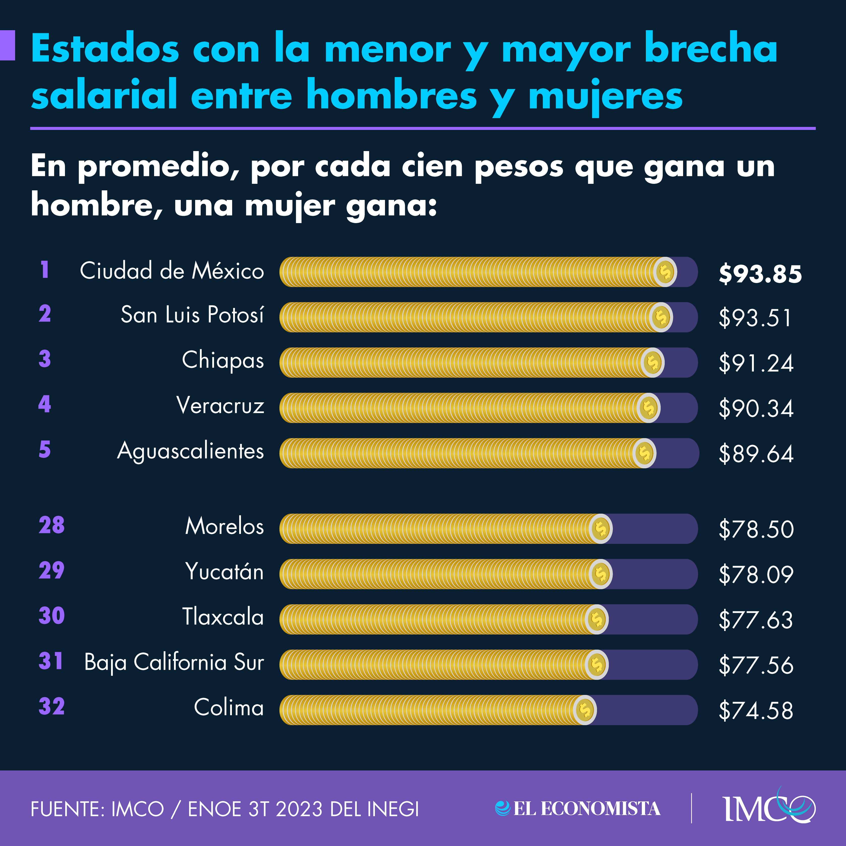 En México, detalla el IMCO, la brecha salarial de género es de 16 por ciento. De esta manera, en promedio, por cada 100 pesos que percibe un hombre por este concepto, una mujer percibe 84 pesos.De acuerdo con el Economista, Colima, Baja California Sur y Tlaxcala son los estados con mayor disparidad en los salarios que perciben hombres y mujeres en México, revela un análisis realizado por el Instituto Mexicano para la Competitividad (IMCO) con base en los datos de la Encuesta Nacional de Ocupación y Empleo (ENOE).*Mantente al día con las noticias, únete a nuestro canal de WhatsApp aquí: https://whatsapp.com/channel/0029VaAf9Pu9hXF1EJ561i03MV