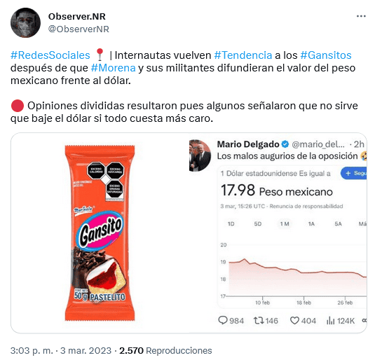 Ayer viernes 3 de marzo, el superpeso rompió la barrera de los 18 pesos por dólar, pues se ubicó en 17.99, ante ello, un usuario de redes sociales revivió la teoría del Gansito, pues pese a que el billete verde bajó el pastelito sigue costando caro.Por medio de Twitter, el usuario @ObserverNR señaló que de nada sirve que baje el dólar si todo seguirá estando en un alto precio.Una búsqueda en Internet arroja que en algunas tiendas comerciales, un Gansito cuestan 15.50 pesos mexicanos, pero en las misceláneas su precio ronda en los 18 pesos.La teoría del Gansito se basa en la idea de que las empresas suben los precios de sus productos existentes para mantener sus márgenes de beneficio, y que los consumidores están dispuestos a pagar más por un producto nuevo o diferente.La teoría del Gansito debe su nombre a un popular pastelito relleno de crema y cubierto de chocolate producido por la empresa Marinela, que se introdujo en el mercado mexicano en 1957.Según la leyenda, cuando se lanzó el Gansito, los precios de los productos similares en el mercado aumentaron debido a la demanda de los consumidores por el nuevo pastelito.Sin embargo, no hay evidencia concreta que respalde la teoría del Gansito.OF