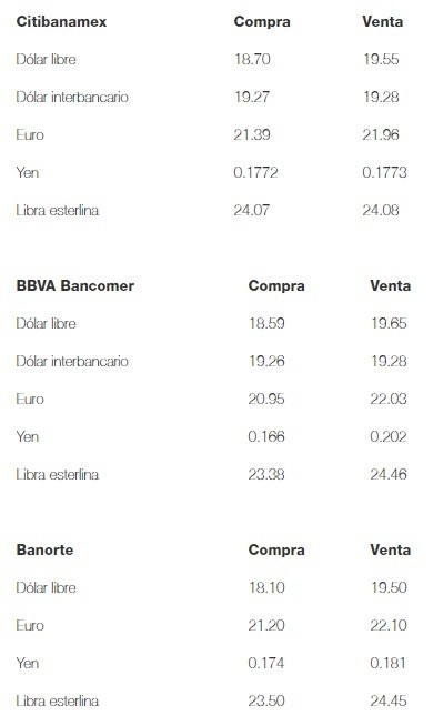 El dólar libre inicia la jornada de este miércoles con una ganancia de 15 centavos en relación con el cierre de ayer, al venderse hasta en 19.65 pesos, y se compra en un precio mínimo de 18.10 pesos en sucursales bancarias de la Ciudad de México.De acuerdo con Banco Base, el peso inicia la sesión con una depreciación de 0.39 por ciento o 7.5 centavos, cotizando alrededor de 19.23 pesos por dólar, pero tocando un máximo de 19.3121 pesos tras el inicio de la conferencia matutina del Presidente Andrés Manuel López Obrador.Destacó que en opinión del Jefe del Ejecutivo, la renuncia de Carlos Urzúa a la Secretaría de Hacienda es parte de un proceso de cambio y podría darse otras renuncias como parte de dicho cambio.La entidad financiera recordó que ayer tras la renuncia de Carlos Urzúa, el tipo de cambio alcanzó un máximo de 19.3552 pesos, debido a que se eleva la incertidumbre con respecto a las políticas de la administración en turno.La carta de renuncia del ex funcionario, expuso, critica directamente la forma en que se están llevando a cabo las acciones al interior del Gobierno federal, algo que de manera indirecta respalda opiniones recientes de las calificadoras que consideran la falta de claridad en la toma de decisiones como un elemento que podría contribuir a recortes a la nota crediticia del país.Banco Base señaló que pese a que la política interna podría generar presiones al alza para el tipo de cambio, en el mercado cambiario se observa un debilitamiento generalizado del dólar, siendo el peso mexicano y el won surcoreano las únicas divisas que pierden terreno.Por otra parte, dijo, el dólar se debilita luego de que se dieron a conocer los comentarios que presentará el presidente de la Reserva Federal (Fed), Jerome Powell, ante comités del Congreso en Estados Unidos.La participación de Powell ante el Panel de Servicios Financieros de la Cámara de Representantes inició a las0 9:00 horas, y hoy a las 13:00 horas también se darán a conocer las minutas de política monetaria de la Reserva Federal (Fed) correspondientes a la reunión del 19 de junio.El próximo anuncio de política monetaria de la Fed está programado para el 31 de julio a las 13:00 horas.Ante este panorama, se espera que el tipo de cambio cotice este miércoles entre 19.10 y 19.35 pesos por dólar.A su vez, el Banco de México (Banxico) informó en el Diario Oficial de la Federación (DOF) que el tipo de cambio para solventar operaciones denominadas en moneda extranjera pagaderas en el país se ubica en 19.0043 pesos.Asimismo, las Tasas de Interés Interbancarias de Equilibrio (TIIE) a 28 y 91 días se ubican en 8.4763 y 8.4735 por ciento, la primera con un retroceso de 0.0024 y la segunda con un avance de 0.0055 puntos porcentuales, respectivamente.OA