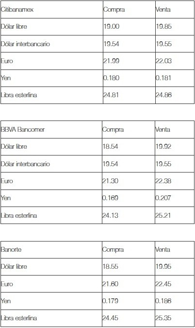 Al finalizar la jornada cambiaria, el dólar libre se vendió hasta en 19.95 pesos, con una variación a la baja de 29 centavos en comparación con el cierre previo, y se adquirió en un precio mínimo de 18.54 pesos en sucursales bancarias de la capital del país.El Banco de México (Banxico) fijó en 19.6007 pesos el tipo de cambio para solventar obligaciones denominadas en moneda extranjera pagaderas en el país.JM