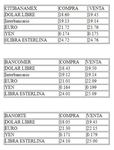 Este martes, en bancos de la Ciudad de México el dólar libre se vende hasta en 19.50 pesos, cuatro centavos menos en comparación con el cierre de ayer, y se adquiere en un precio mínimo de 18.05 pesos.En opinión de Banco BASE, persisten las dudas sobre la posibilidad de que China y Estados Unidos lleguen a un entendimiento comercial, pues todavía existen amplias diferencias en materia de protección industrial.Explicó que se teme que el panorama económico para 2019 sea peor de lo que se creía, luego de que el Fondo Monetario Internacional (FMI) ajustó a la baja sus previsiones de crecimiento económico global a 3.5 por ciento para 2019 y a 3.6 por ciento para 2020, cifras que se ubican por debajo de las estimaciones previas de 3.7 por ciento para ambos años.Apuntó que debido a que ayer el mercado financiero en Estados Unidos permaneció cerrado por la conmemoración del día de Martin Luther King, la reacción negativa a las amenazas para el crecimiento económico se verá reflejada hasta el día de hoy.De igual manera, este martes se observó aversión al riesgo en los mercados asiáticos, pues el reporte del FMI se publicó el día de ayer luego del cierre de la sesión asiática.Por otro lado, en Estados Unidos se cumplen 32 días desde que el gobierno cerró operaciones parciales, ante la falta de un acuerdo de financiamiento entre los demócratas y el presidente Donald Trump. En la sesión, se espera que el tipo de cambio cotice entre 19.05 y 19.25 pesos por dólar.El Banco de México (Banxico) informa en el Diario Oficial de la Federación (DOF) que el tipo de cambio para solventar operaciones denominadas en moneda extranjera pagaderas en el país se coloca en 19.1902 pesos.Asimismo, las Tasas de Interés Interbancarias de Equilibrio (TIIE) a 28 y 91 días se ubican en 8.6000 y 8.6175 por ciento, ambas con una ganancia de 0.0075 y 0.0025 puntos porcentuales, respectivamente.OA