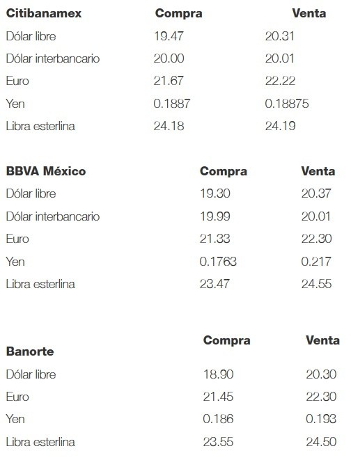 El dólar libre cerró la jornada cambiaria de este martes en un precio máximo de 20.37 pesos, es decir, 14 centavos menos comparado con el cierre de ayer, y se compró en un mínimo de 18.90 pesos en bancos de la capital.El Banco de México (Banxico) fijó en 20.0039 pesos el tipo de cambio para solventar obligaciones denominadas en moneda extranjera pagaderas en el país.• Dólar abre jornada con retroceso, se vende en 20.39 pesosJM
