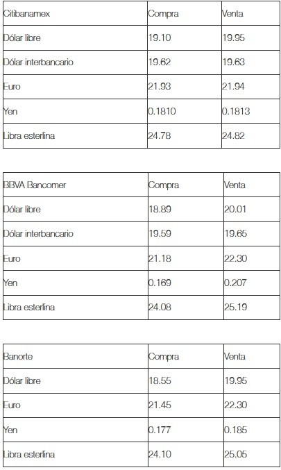 En ventanillas bancarias, el dólar se vende en 19.95 en Citibanamex y Banorte, en tanto que en BBVA Bancomer se mantuvo en 20.01 pesos al cierre.