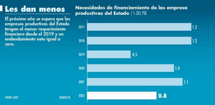 Las necesidades de financiamiento de las llamadas empresas productivas del Estado mostrarán una disminución, como porcentaje del Producto Interno Bruto (PIB), el siguiente año, de acuerdo con las proyecciones hechas por la Secretaría de Hacienda y Crédito Público (SHCP) en su Plan Anual de Financiamiento 2022.De acuerdo con el documento, para el siguiente año Petróleos Mexicanos (Pemex) y la Comisión Federal de Electricidad (CFE) requerirán de 217 mil 400 millones de pesos para cubrir sus necesidades de financiamiento, lo que representa 0.8% del PIB.Lo anterior es menor en 0.3 puntos del PIB en comparación con lo de este 2021, cuando las necesidades se estimaron en 280 mil 700 millones de pesos, es decir, 1.1% del PIB.James Salazar, subdirector de Análisis Económico de CIBanco, explicó que esta disminución va en línea con la estrategia que se ha llevado para intentar reducir el costo financiero de estas empresas a través de permutas, inyección de capital o recompra de bonos, como se vio al inicio de este mes con Pemex y los 3 mil 500 millones de dólares que el gobierno le aportó.“Esto ayuda a tener un menor requerimiento financiero para el siguiente año, y es lo que vemos reflejado, pero en el transcurso del siguiente año las cosas pueden cambiar si la situación se complica”, dijo.En total, Hacienda calcula que la petrolera necesitará 197 mil 100 millones de pesos de financiamiento el siguiente año, lo que representa 0.7% del PIB contra 0.8% este año, mientras que la CFE requiere de 20 mil 300 millones de pesos, 0.1% del PIB, menor al 0.2% de este 2021.“Se espera alcanzar el objetivo de endeudamiento neto igual a cero en términos reales al cierre del ejercicio 2021 para Pemex. Para el 2022, continuará con el objetivo de mantener un endeudamiento neto igual a cero en términos reales para el resto de la administración. La política de financiamiento continuará enfocada en el refinanciamiento de las amortizaciones del año, buscando un balance prudente de riesgo y costo, y manteniendo una planeación financiera que permita hacer frente a posibles periodos de volatilidad e incertidumbre que pudieran presentarse”, indicó la dependencia.En el caso de la CFE, la SHCP indicó que se orienta a obtener los recursos necesarios en los mejores términos y condiciones en cuanto a monto, costo, plazo y estructura, ello para impulsar los proyectos de inversión en infraestructura.Aumentan requerimientos en banca de desarrolloEn contraste con las empresas productivas del Estado, la banca de desarrollo incrementará sus necesidades de financiamiento el año que está por comenzar lo cual, comentó James Salazar, va de la mano con la estrategia del gobierno de darle mayor impulso a este sector.De acuerdo con el Plan Anual de Financiamiento, los recursos que necesitará la banca de desarrollo en el 2022 pasarán de representar 2.2% del PIB a 2.5 por ciento. En total, sus necesidades de financiamiento se calculan en 708 mil 200 millones de pesos.“La política de financiamiento de la Banca de Desarrollo para el 2022, continúa con una estrategia dinámica y flexible para fortalecer los principales indicadores financieros y del capital de los bancos. Permanecerá centrándose en la eficiencia del portafolio de pasivos a través de una adecuada gestión que se ajuste a las condiciones de mercado, manteniendo niveles sanos de financiamiento de corto, mediano y largo plazos y considerando las características de los activos a financiar. También se recurrirá al mercado local buscando oportunidades en el mercado de deuda que permitan utilizar ofertas públicas en formatos tanto de tasas flotantes como tasas fijas”, explicó la SHCP.Agregó que se continuará con la emisión de Cebures de mediano y largo plazos, Certificados de Depósitos y la emisión de bonos temáticos para dar prioridad a la estrategia de financiamiento sustentable, uno de los temas que ha sido impulsado fuertemente por la Secretaría de Hacienda a través de bonos sostenibles que se vinculan con los objetivos de desarrollo sustentable.Banobras será la institución con mayores necesidades de financiamiento, con un monto de 353 mil 200 millones de pesos, esto es 1.2% del PIB. Le sigue Nafin, con 209 mil 100 millones de pesos, lo que significa 0.7% del PIB.Bancomext, por su parte, necesitará de 111 mil 500 millones de pesos, mientras que la Sociedad Hipotecaria Federal 40 mil 400 millones de pesos, 0.4 y 0.1% del PIB, respectivamente.Gobierno será flexibleEn total, las necesidades de financiamiento del sector público son de 3.7 billones de pesos, 13.2% del PIB. El monto es menor al de este año, cuando se necesitaron 4.02 billones de pesos, es decir, 15.3% del PIB.“En el 2022, el Gobierno Federal: trabajará de forma eficiente en el manejo de pasivos para mejorar el perfil de vencimientos del portafolio de deuda; permanecerá activo en la búsqueda de ventanas de oportunidad en los mercados financieros con el objetivo de satisfacer las necesidades de financiamiento al menor costo y riesgo posible; y será flexible para adaptar su estrategia de financiamiento ante las condiciones prevalecientes en el entorno económico”, se lee en el documento.