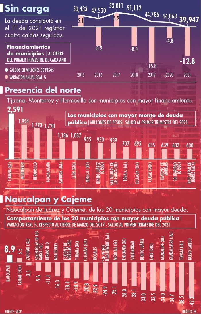 A diferencia de la dinámica de los gobiernos estatales, las administraciones municipales disminuyeron sus obligaciones financieras en el primer trimestre del año en curso.De acuerdo con datos de la Secretaría de Hacienda y Crédito Público, la deuda municipal ascendió a 39,947 millones de pesos al cierre de marzo, 4,116 millones menos respecto a igual lapso del 2020.La tasa anual real resultó en -12.8%, que representó registrar cuatro caídas consecutivas, considerando el mismo periodo de análisis: -8.4% en el 2018, -15.8% en el 2019 y -4.8% en el 2020. En términos generales, los municipios se apegaron más al proceso electoral y a la Ley de Disciplina Financiera que a las necesidades surgidas por la crisis económica derivada de la pandemia por COVID-19.En tanto, los municipios con el mayor monto de deuda pública fueron Tijuana, Baja California (2,591 millones de pesos); Monterrey, Nuevo León (1,954 millones); Hermosillo, Sonora (1,773 millones); Guadalajara, Jalisco (1,720 millones); Zapopan, Jalisco (1,186 millones); León, Guanajuato (1,037 millones); Mexicali, Baja California (955 millones), y Benito Juárez, Quintana Roo (950 millones de pesos).De los 20 municipios con mayor deuda, que aportan 50% del total de los financiamientos municipales, solo Naucalpan de Juárez en el Estado de México y Cajeme en Sonora mostraron aumentos reales entre el primer trimestre del 2017, el punto más alto, e igual periodo del 2021, con tasas de 8.9 y 5.5% real, respectivamente.Mientras las caídas más pronunciadas se dieron en Nuevo Laredo, Tamaulipas (-42.3%); Tonalá, Jalisco (-38.5%); Guadalajara, Jalisco (-34.7%); Guadalupe, Nuevo León (-34.0%); León, Guanajuato (-33.5%), y Benito Juárez, Quintana Roo (-33.0 por ciento).Según el reporte Hablemos de deuda del Imco, “los municipios representan un pequeño porcentaje de la deuda subnacional y la gran mayoría de ellos no tiene saldos de deuda mientras que 50 municipios, todos urbanos, concentran la mayor parte de la deuda municipal del país. Esto nos indica que muchos municipios no han desarrollado las capacidades administrativas para contratar deuda. Clara muestra de la gran asimetría entre los municipios rurales y urbanos del país.“Estamos viviendo tiempos de crisis económica en donde la deuda podría servir como mecanismo para invertir y traer alivio económico a las y los mexicanos. Un mayor endeudamiento no necesariamente implica un problema para las finanzas públicas. Un endeudamiento saludable tampoco equivale a un buen uso de los recursos adquiridos por el endeudamiento, en este sentido, se debe procurar el uso productivo de ella”, detalla el estudio.