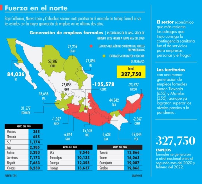 Las regiones centro y sur-sureste del país todavía resienten los efectos negativos de la pandemia de COVID-19 en el mercado laboral.Al cierre de febrero del 2022, ocho entidades se ubicaron por debajo de los niveles prepandemia de generación de empleo formal, siendo la Ciudad de México, la economía más grande del territorio nacional, la más castigada.De acuerdo con datos de la Secretaría del Trabajo y Previsión Social (STPS), la capital del país registró una pérdida de -125 mil 578 trabajos asegurados en el Instituto Mexicano del Seguro Social (IMSS) entre febrero del 2020, antes de que llegara el virus a México, e igual mes del presente año.El talón de Aquiles de la Ciudad de México corresponde a servicios para empresas, personas y el hogar (privados), con una merma de -173 mil 055 plazas en el periodo analizado; otros sectores con bajas laborales fueron manufactura (-37 mil 702), actividades primarias (-522) e industrias extractivas (-109).Mientras los sectores que rebasaron los niveles prepandémicos fueron comercio (34 mil 059 nuevos trabajos formales), transportes y comunicaciones (23 mil 037), servicios sociales y comunales (18 mil 156), construcción (10 mil 067) e industria eléctrica y suministro de agua potable (491).Destaca que los planes de reactivación económica del gobierno capitalino se enfocaron en detonar la industria de la construcción, sector que si bien ya se recuperó, sus resultados fueron insuficientes para que el empleo total de la Ciudad de México superara el umbral prepandémico.El estado que exhibió la segunda mayor pérdida laboral fue Quintana Roo, con 23 mil 327 trabajadores asegurados en el IMSS menos en febrero del 2022, respecto a igual mes del 2020.Las principales debilidades de la entidad federativa con vocación turística se observaron en servicios privados (-25 mil 511 bajas en el lapso de estudio), comercio (-3 mil 673) y construcción (-2 mil 698); el sector económico con más plazas creadas fue el que refiere a transportes y comunicaciones -actividades logísticas- ( mil 496 trabajadores inscritos en el Seguro Social).El podio de mayores pérdidas laborales lo completó Veracruz al registrar un saldo negativo de -19 mil 044 trabajos formales.De los nueve sectores considerados, solamente uno creó puestos en los últimos dos años: comercio (4 mil 829). En tanto, las peores mermas se dieron en servicios privados (-7 mil 203), manufactura (-5 mil 781), construcción (-5 mil 352) y actividades primarias (-2 mil 364).Las otras entidades que todavía se encuentran por debajo de los niveles prepandemia fueron Puebla (-15 mil 503 trabajos menos entre febrero del 2020 y el mismo mes del presente año), Guerrero (-6 mil 844), Oaxaca (-5 mil 638), Campeche (-2 mil 367) y Michoacán (menos mil 027).El común denominador de estos territorios es que su gran flaqueza fue el sector de servicios para empresas, personas y el hogar, pese a que se redujeron las limitaciones en la movilidad social y, por consiguiente, en el consumo privado.PotenciasA nivel nacional, se generaron 327 mil 750 empleos formales entre el segundo mes del 2020 y febrero del 2022.De la frontera norte de México, cuatro entidades se colocaron en los primeros lugares, mientras del Bajío, tres representantes en el top 10; la gran excepción del sureste del país fue Tabasco.Baja California fue el estado con la mayor generación de trabajos asegurados en el IMSS, con 84 mil 036 altas en el periodo considerado; además, fue el primero en superar los niveles prepandémicos.La industria de la transformación fue el motor laboral de la entidad con 60 mil 321 empleos creados; su único pendiente es el sector de servicios privados (una pérdida de -7 mil 369 trabajos).A Baja California le siguieron Nuevo León (77 mil 894 plazas generadas) y Chihuahua (53 mil 287); también la manufactura fue su detonador. En cuarto lugar quedó Tabasco (44 mil 842), cuya apuesta por la obra pública se reflejó en la industria de la construcción (80.5% del creado), mientras la quinta posición fue para Jalisco (36 mil 656).El top 10 lo completaron Estado de México (31 mil 577 altas en el IMSS), Coahuila (27 mil 259), Querétaro (26 mil 053), Sinaloa (19 mil 866) y Guanajuato (19 mil 087).También sobresalieron Sonora (16 mil 063), Yucatán (13 mil 866), Hidalgo (13 mil 637), Durango (12 mil 358), Tamaulipas (10 mil 133) y Baja California Sur (9 mil 546).Con menos de 9 mil trabajos generados y más de mil se encontraron Chiapas (8 mil 230), Nayarit (7 mil 663), Zacatecas (7 mil 173), Colima (3 mil 283), Aguascalientes (2 mil 385) y San Luis Potosí (mil 174).Los territorios con una menor generación de empleos formales fueron Tlaxcala (655) y Morelos (355), aunque ya lograron superar los niveles previos a la pandemia.Análisis sectorialEl sector económico que más resiente los estragos que trajo consigo la contingencia sanitaria fue el de servicios para empresas, personas y el hogar. A nivel nacional, la pérdida asciende a -398 mil 214 trabajos formales entre febrero del 2020 y el mismo mes del 2022.Por entidad, solamente cuatro rebasaron el umbral prepandemia: Nayarit (mil 882 plazas creadas), Aguascalientes (513), Baja California Sur (380) y Chiapas (40). Estos estados recuperaron los puestos dados de baja durante la pandemia, síntoma de que su mercado interno se reactivó.Los otros sectores con mayor impacto por la contingencia sanitaria fueron los de agricultura, ganadería, silvicultura, pesca y caza, con 19 estados que aún tienen mermas laborales, y construcción, con 17 territorios.Al otro extremo, la manufactura es el sector con el menor número de entidades que mostraron pérdidas en los últimos dos años: Quintana Roo (-62 bajas), Baja California Sur (-691), Sinaloa (-874), Guerrero (menos mil 454), Veracruz (-5 mil 781) y Ciudad de México (-37 mil 702).