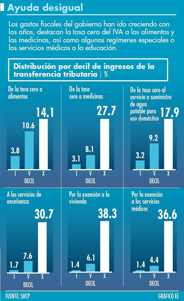 Las exenciones y la tasa cero del Impuesto al Valor Agregado (IVA), dos de los gastos fiscales que registra año con año el erario público, benefician más a los contribuyentes que se ubican en los últimos deciles, es decir, aquellos con mayores ingresos, de acuerdo con lo mostrado en el documento de “Renuncias Recaudatorias 2021”.“En México, por cada 100 pesos destinados a mantener la tasa cero en ciertos bienes y servicios, 10% más pobre de la población recibe menos de cinco pesos, mientras que 10% con mayores ingresos recibe más de 20 pesos”, explicó un reporte del Centro de Investigación Económica y Presupuestaria (CIEP)Si bien en el documento que elabora la Secretaría de Hacienda y Crédito Público (SHCP) sobre las renuncias recaudatorias se indica que éstas tienen un beneficio para los contribuyentes de todos los deciles a través de transferencias, también muestra que son los últimos deciles los que concentran la mayor parte de dichas transferencias.“La aplicación de la tasa cero y las exenciones en el IVA representan una transferencia tributaria para todos los hogares, con independencia de su nivel de ingresos, ya que se otorga en forma generalizada”, se lee en el documento.Por ejemplo, en el caso de las exenciones, Hacienda detalla que la transferencia tributaria que se refiere a los servicios de enseñanza se concentra en el decil X, con 30.7%, mientras que el decil I apenas representa 1.7 por ciento.Caso similar es con las exenciones a la vivienda y a los servicios médicos. En el primer caso, el último decil representa 38.3% de las transferencias, mientras que el decil I apenas en 1.4%, mientras que en los servicios médicos los contribuyentes más ricos tienen 36.6% contra 1.4% de aquellos con menores recursos.Respecto a la tasa cero del IVA a alimentos, uno de los temas que genera mucha discusión sobre si debe o no seguir aplicándose, Hacienda detalló que los causantes que se encuentran en el último decil concentran 14.1% de las transferencias, mientras que en el decil I es 3.8 por ciento.“Los hogares del primer decil de ingresos son los que reciben una menor proporción de la transferencia que la renuncia recaudatoria implica, mientras que los del decil más alto concentran la mayor parte de la transferencia. Ello obedece a que los hogares más ricos concentran la mayor parte del gasto en alimentos”, señaló la SHCP.En tanto, en la tasa cero del IVA en medicinas, el decil X tiene una transferencia que representa 27.7%, mientras que en el primer decil es de 3.1 por ciento.Brecha ha disminuidoSi bien la brecha de ingresos entre los hogares de ingresos más altos y menores ingresos es menor pero persiste. De acuerdo con la Encuesta Nacional de Ingresos y Gastos de los Hogares (ENIGH) 2018, del Instituto Nacional de Estadística y Geografía, los hogares más ricos ganan 18.2 veces más que los más pobres.Los datos muestran que, de manera trimestral, el ingreso corriente de un hogar del decil I en México es de 9,113 pesos, es decir, ganan alrededor de 3,037 pesos al mes, mientras que los hogares del último decil tienen un ingreso promedio trimestral de 166,750 pesos, lo que representan 55,583 pesos al mes.La brecha entre estos deciles es menor a la que se registró en la ENIGH 2016, cuando el primer decil tuvo ingresos por 9,084 pesos y el décimo de 187,829 pesos, es decir 21 veces más.La misma encuesta señaló que, del lado del gasto, las familias mexicanas destinan 35% de éste a los alimentos y bebidas.ControversiaLos gastos fiscales y, en general, el sistema fiscal, muestra cada vez más la desigualdad que existe en el país, por lo cual varios expertos han pedido una reforma fiscal integral que haga una revisión a los gastos fiscales, como pueden ser las exenciones y tasa cero del IVA; no obstante, esto también ha generado controversia.Ya que aunque beneficia a los de mayores ingresos, afectaría a deciles más bajos, pues destinan una mayor cantidad de su ingreso a alimentos.Las exenciones que se aplican en el IVA son a servicios de enseñanza, vivienda, servicios profesionales de medicina, espectáculos públicos, así como servicio de transporte público terrestre de personas que se preste exclusivamente en áreas urbanas, suburbanas o en zonas metropolitanas, mientras que la tasa cero se aplica en alimentos, medicinas, servicios o suministro de agua potable para uso doméstico, otros productos, así como libros, periódicos y revistas.NUMERALIA61 mil 250 MDP es la renuncia recaudatoria por las exenciones en el IVA este año.307 mil 817 MDP es la renuncia recaudatoria prospectada para la tasa cero.