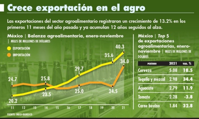 De enero a noviembre, las exportaciones mexicanas de bienes agroalimentarios se expandieron 13.2% a 40 mil 289 millones de dólares, hilando con ello crecimientos ininterrumpidos desde el 2010, de acuerdo con datos de la balanza comercial de México actualizados por el Instituto Nacional de Geografía y Estadística (Inegi).Cuatro de los cinco productos más exportados por México durante el período tuvieron incrementos en valor de exportación muy superiores al promedio. La cerveza, líder de la lista, mostró un aumento interanual de 18.5% a 5 mil 081 millones de dólares.Le siguieron el tequila y el mezcal, con un avance de 34.4% a 2 mil 976 millones de dólares; el aguacate, con un salto de 11.6% a 2 mil 791 millones y la carne de bovino, que creció 32.8% a mil 836 millones de dólares. En este grupo, únicamente el tomate exhibió un retroceso, que fue de 3.8% a 2 mil 275 millones de dólares.Por su parte, las importaciones agroalimentarias tuvieron un alza de 38.8%, producto de una menor base de comparación (el año pasado se contrajeron 7%, mientras que las exportaciones no dejaron de crecer) y reflejo de una reactivación del consumo interno, tras la contracción económica por el COVID-19.Pese a lo anterior, el saldo de la balanza comercial agroalimentaria se mantiene en terreno positivo por séptimo año consecutivo, con un superávit de 6 mil 333 millones de dólares, 43.1% inferior al del 2020.