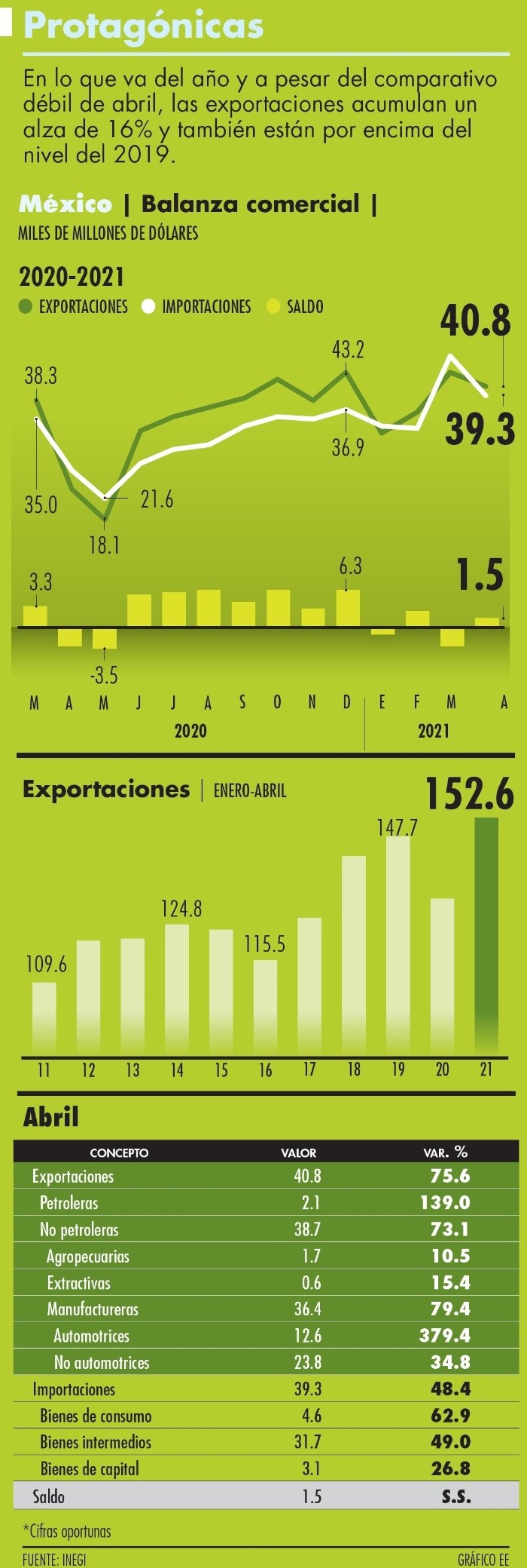 Las exportaciones mexicanas de productos crecieron 75.6% en abril y 16% en el acumulado en los primeros cuatro meses de 2021, a tasas interanuales, reflejando la recuperación de los mercados externos, sobre todo de Estados Unidos, informó el Inegi.Con ello, las ventas externas de mercancías fueron de 40 mil 772.8 millones de dólares en abril y sumaron un nivel récord de 152 mil 636.6 millones de enero a abril. Aunque estas métricas están fuertemente sesgadas al alza por las distorsiones de un efecto de base favorable, pues los confinamientos más severos por la pandemia fueron en abril y mayo de 2020, lo que llevó a la actividad total a niveles muy bajos.Juan Carlos Alderete y Francisco Flores, analistas de Banorte, ven resultados positivos en el comercio ante el soporte de la demanda externa, aunque retos para un mayor crecimiento permanecen ante la escasez de insumos, especialmente para las manufacturas.Un ejemplo del sesgo estadístico está en las ventas externas del sector automotriz, que se dispararon 379.4%, con la consideración de que esa industria no fue considerada como una actividad esencial en abril y mayo del año pasado, lo que resultó en el cierre de prácticamente todas las fábricas.Con series ajustadas por estacionalidad, en abril de 2021 las exportaciones totales de mercancías mostraron un aumento mensual de 0.24%, resultado neto de un incremento de 0.28% en las exportaciones no petroleras y de una reducción de 0.42% en las petroleras.En sentido contrario, las importaciones también mostraron dinamismo, al crecer 48.4% en abril y 16.3% en el acumulado respectivo, mostrando una cierta recuperación del mercado interno y de su capacidad productiva.Así, las importaciones en abril totalizaron 39 mil 272.1 millones de dólares y en el acumulado alcanzaron 152 mil 643.5 millones. El alza de las exportaciones se benefició además por recuperación de la economía estadounidense, en gran medida por el paquete de estímulos fiscales y la amplitud de los niveles de vacunación.Al interior de las exportaciones, las petroleras crecieron en abril 139%, a 2 mil 058.1 millones de dólares, apoyadas por mejores precios del crudo, y las no petroleras escalaron 73.1%, a 38 mil 714.7 millones.La pandemia de coronavirus provocó una desaceleración grave y sincronizada de la actividad económica durante la primavera de 2020. Muchas empresas se vieron muy afectadas cuando sociedades de todo el mundo cambiaron su comportamiento y se introdujeron restricciones para reducir la propagación de la infección.Con los cambios recientes, en los cuatro primeros meses de 2021, las importaciones mexicanas avanzaron con una mayor fuerza en los bienes destinados para producción inmediata y futura, que en los bienes de consumo, aunque estos últimos se incrementaron 62.9% en abril a tasa anual.Mientras las importaciones de bienes intermedios subieron en abril 49%, las de bienes de capital aumentaron 26.8 por ciento. De enero a abril, las importaciones de bienes de consumo se incrementaron 5.5%, en tanto que las de bienes intermedios crecieron 18.6% y las de bienes de capital aumentaron 11.3 por ciento.El saldo de la balanza comercial registró un superávit de mil 500.6 millones de dólares en abril y prácticamente no se movió en el acumulado, al igualarse las compras con las ventas externas.La cifra de las exportaciones no petroleras se integró por mil 695.5 millones de dólares en las agropecuarias (una variación de 10.5%), 638.3 millones en las extractivas (15.4%) y 36mil 380.9 millones en las manufactureras (79.4 por ciento).“Esperamos exportaciones elevadas debido a la expansión de la economía norteamericana, mientras que las importaciones (sin bienes intermedios) podrían ser más modestas debido a la relativa debilidad de la demanda interna en México”, dijo Ricardo Aguilar, analista de Invex.