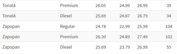 ¿Cuáles son los precios promedio de combustible en los municipios de la Zona Metropolitana de Guadalajara (ZMG)?El Instituto de Información Estadística y Geográfica de Jalisco (IIEG) detalla en su portal, los precios de combustible de los seis principales municipios: Guadalajara, Tlajomulco, Tlaquepaque, Tonalá, Zapopan y El Salto.La información se actualiza de manera diaria por las mañanas, con información de la Comisión Reguladora de Energía (CRE).Esta información corresponde a los precios de este lunes 12 de agosto de 2024.*Mantente al día con las noticias, únete a nuestro canal de WhatsApp aquí: https://whatsapp.com/channel/0029VaAf9Pu9hXF1EJ561i03 MV