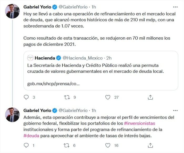 El Gobierno federal, a través de la Secretaría de Hacienda y Crédito Público (SHCP), realizó este miércoles un intercambio de deuda con inversionistas que vencía este año y en el 2023 por otra de más largo plazo por un total de 212 mil 103 millones de pesos.No se incurrió en endeudamiento adicional y se hizo cumpliendo con los techos de endeudamiento aprobados por el Congreso de la Unión para el ejercicio fiscal 2021, destacó la SHCP.La operación de intercambio de valores gubernamentales se realizó con inversionistas institucionales que participan en el mercado de deuda local.Lo anterior con el propósito de optimizar el perfil de vencimientos de la deuda interna del gobierno federal, y permitir a los tenedores de estos instrumentos, recalibrar sus portafolios.Esto ayudará a contribuir a preservar el buen funcionamiento del mercado de deuda local, en la parte corta tanto de la curva nominal como real, dijo la SHCP.De acuerdo con la dependencia, en esta permuta o intercambio la SHCP compró Bonos M y Udibonos en manos de inversionistas institucionales con fecha de vencimiento de entre 2021 y 2023.Al mismo tiempo vendió Bonos M, Udibonos y Bondes F documentados para el 2024 y 2031. La operación estuvo abierta al intercambio cruzado entre instrumentos con tasa fija nominal, tasa fija real y tasa flotante, detalló.Para el intercambio la SHCP realizó dos transacciones: primero canceló deuda a través de una recompra a tasas de interés de mercado de Bonos M y Udibonos con vencimientos entre 2021 y 2023, por un monto de 212 mil103 millones de pesos.Después convocó a una subasta de colocación de valores gubernamentales por 217 mil 275 millones de pesos con vencimiento entre 2023 y 2031, oferta que despertó un apetito por parte de los inversionistas por hasta 231 mil 728 millones de pesos.JM